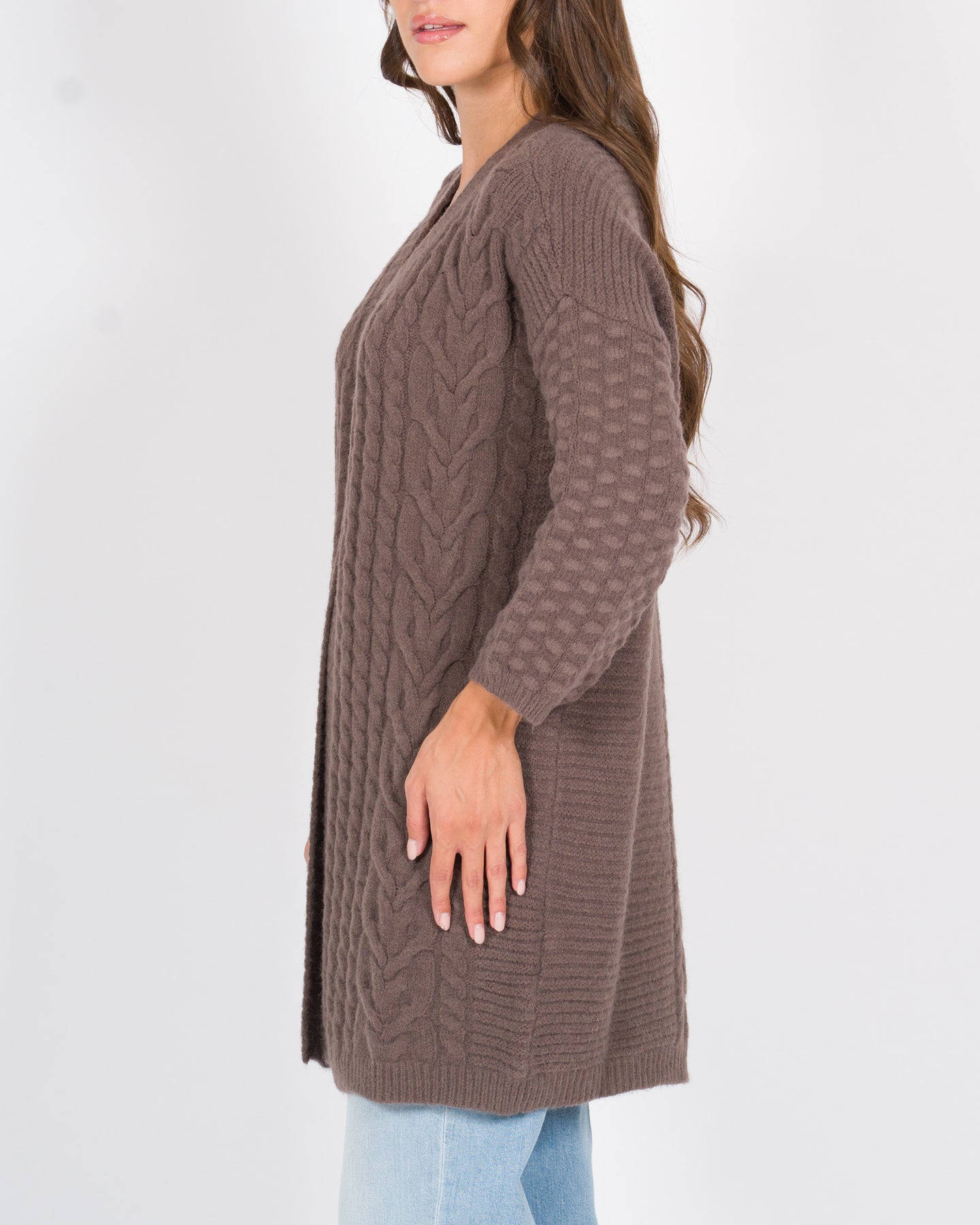 Cardigan lungo senza bottoni, realizzato in morbido tessuto di viscosa con una raffinata lavorazione a trecce che dona texture e movimento al capo. Le maniche raglan assicurano una vestibilità comoda e fluida, mentre il taglio regular lo rende versatile e adatto a diverse silhouette.Perfetto da indossare aperto su top e camicie, è un capo passe-partout ideale per completare il look con eleganza.Dettagli tecnici:Tessuto: viscosaLavorazione trecce Colore: cacaoLa modella indossa la taglia S/M ed è alta 1.70