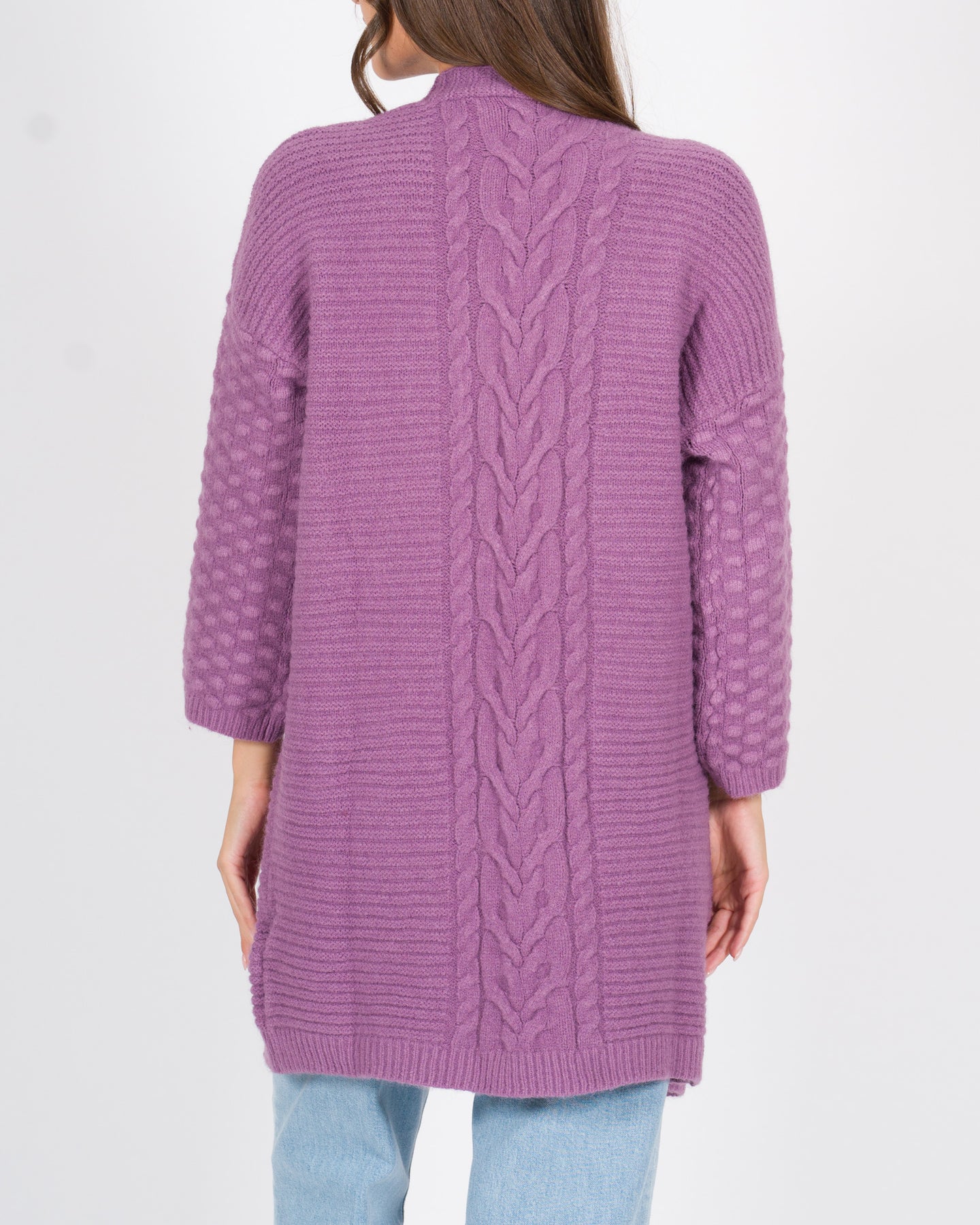Cardigan lungo senza bottoni, realizzato in morbido tessuto di viscosa con una raffinata lavorazione a trecce che dona texture e movimento al capo. Le maniche raglan assicurano una vestibilità comoda e fluida, mentre il taglio regular lo rende versatile e adatto a diverse silhouette.Perfetto da indossare aperto su top e camicie, è un capo passe-partout ideale per completare il look con eleganza.Dettagli tecnici:Tessuto: viscosaLavorazione trecce Colore: melanzanaLa modella indossa la taglia S/M ed è alta 1.70