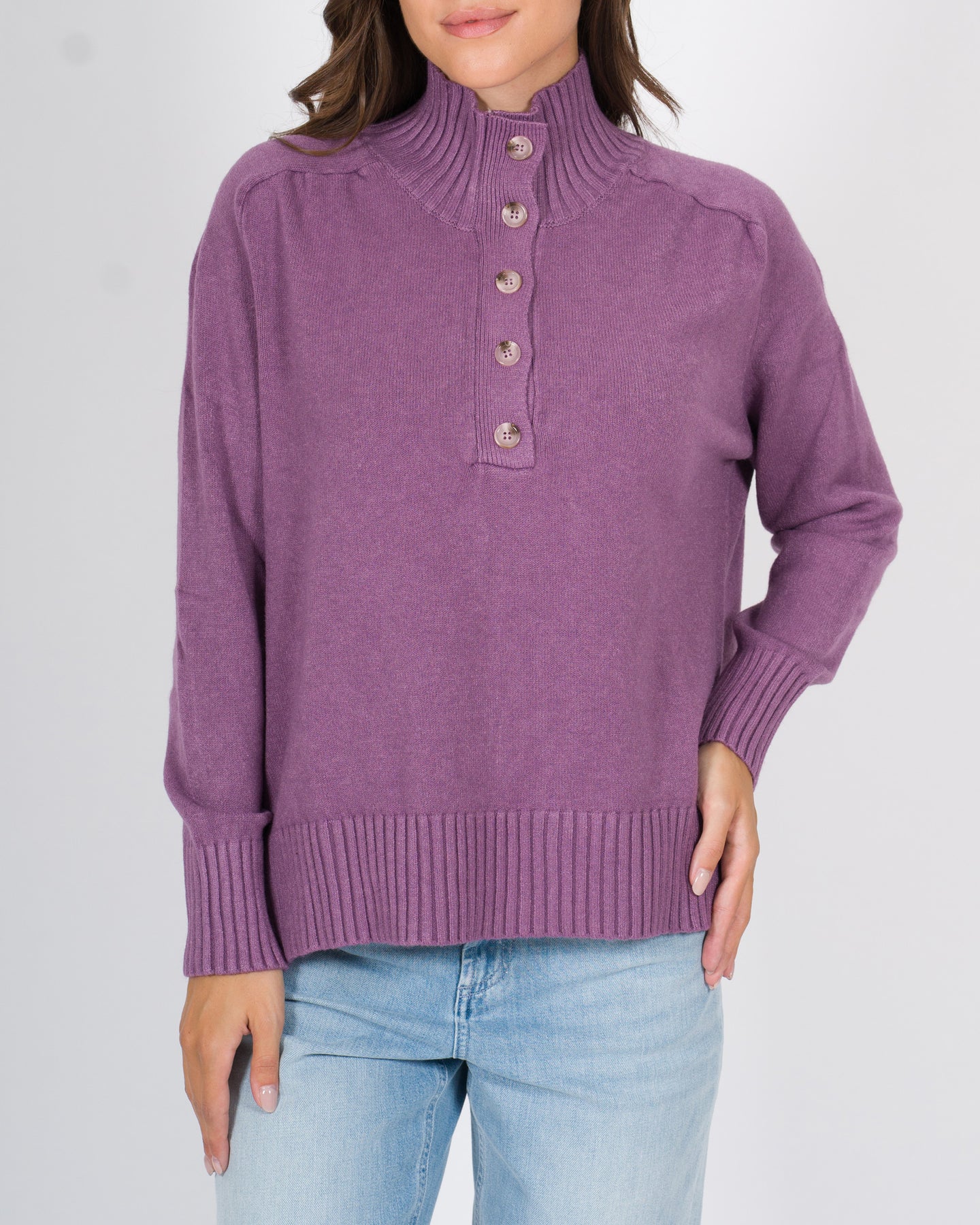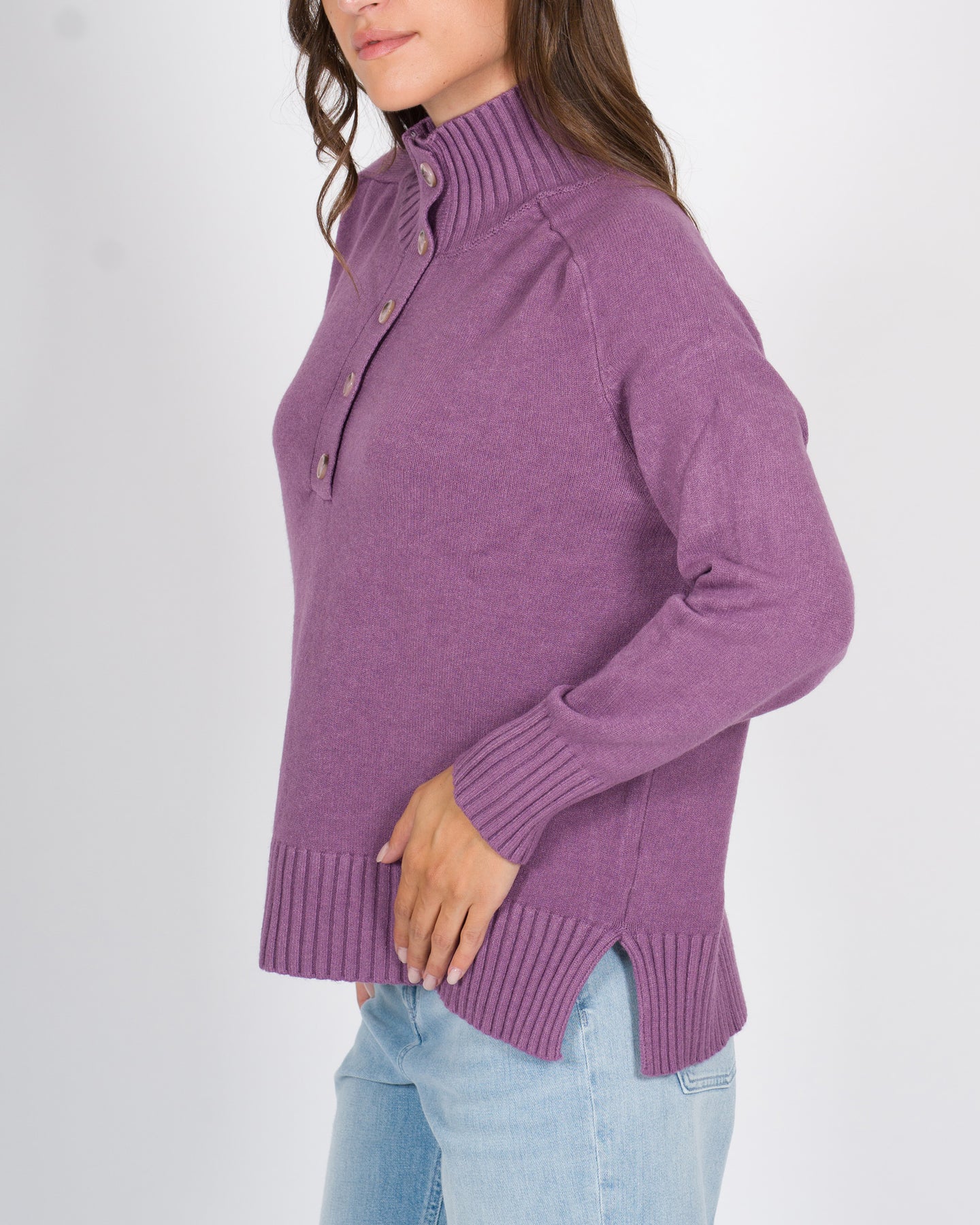 Maglia elegante e versatile realizzata in morbido tessuto di viscosa, perfetta per un look curato e confortevole. Il modello presenta maniche lunghe e un raffinato collo pistagna a coste, che dona un tocco moderno e strutturato al capo. La chiusura con cinque bottoni sul davanti aggiunge un dettaglio distintivo e permette di regolare l'apertura secondo il proprio stile. Il design essenziale ma ricercato rende questa maglia ideale sia per contesti casual che più formali.Dettagli tecnici:Chiusura 5 bottoniTessuto: viscosaColore: melanzanaLa modella indossa la taglia S/M ed è alta 1.70