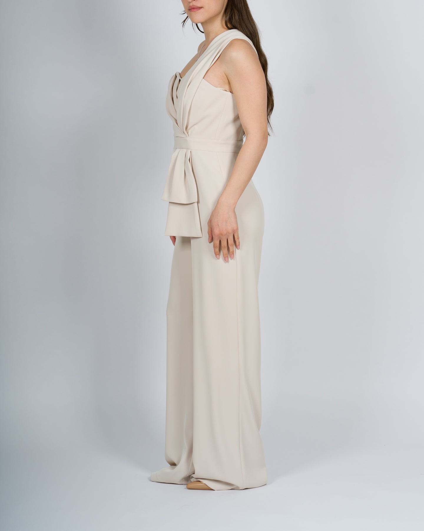 -Tessuto morbido e leggero-Tuta modello palazzo-Scollo a cuore con drappeggi-Monospalla-Vita alta e stretta-Chiusura con zip invisibile sul retro-Il modello è adatto per occasioni eleganti, feste e cerimonie.-La modella indossa la taglia S, altezza 1.70 cm