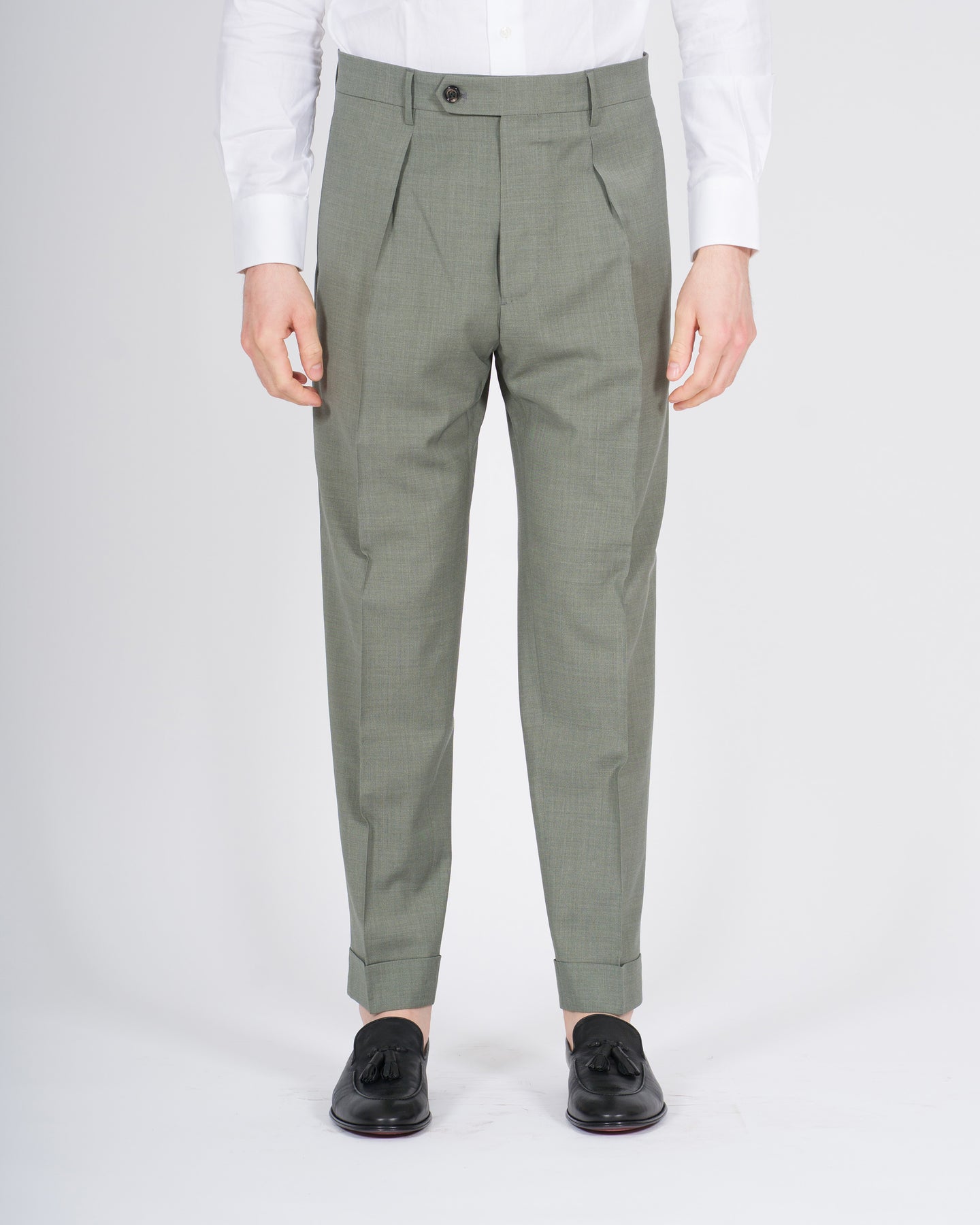 Il pantalone modello Chiaia Berwich fa parte della collezione Primavera Estate ed è pensato per l'uomo e la donna di Carillo Nola, interpretando uno stile sartoriale raffinato e contemporaneo. Un capo che unisce ricerca dei materiali, cura costruttiva e un'estetica senza tempo.Realizzato in pregiato tessuto Zegna, nella sofisticata tonalità verde, presenta una composizione in 70% lana e 30% viscosa, ideale per la stagione più calda grazie alla sua leggerezza, traspirabilità e fluidità. Il modello è caratterizzato da pence frontali, che definiscono la silhouette, e da risvolto sul fondo, dettaglio iconico della tradizione sartoriale italiana.Rispetto alla versione precedente, il pantalone Chiaia è stato allungato di 3 cm, offrendo una vestibilità più attuale ed equilibrata, perfetta per accompagnare look eleganti e casual sofisticati durante la stagione Primavera Estate.Un capo essenziale e distintivo, espressione dell'identità Berwich e dell'eccellenza del made in Italy.