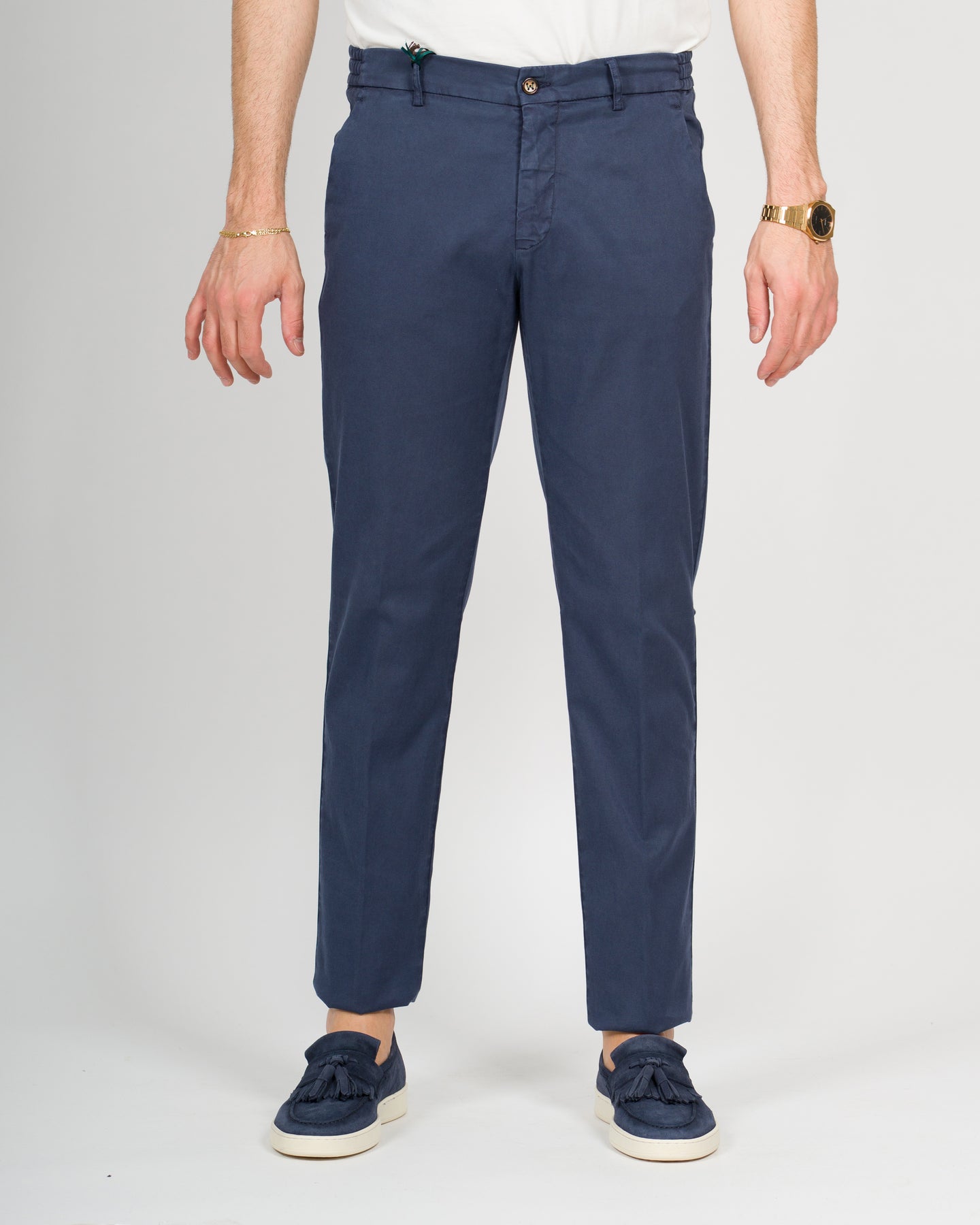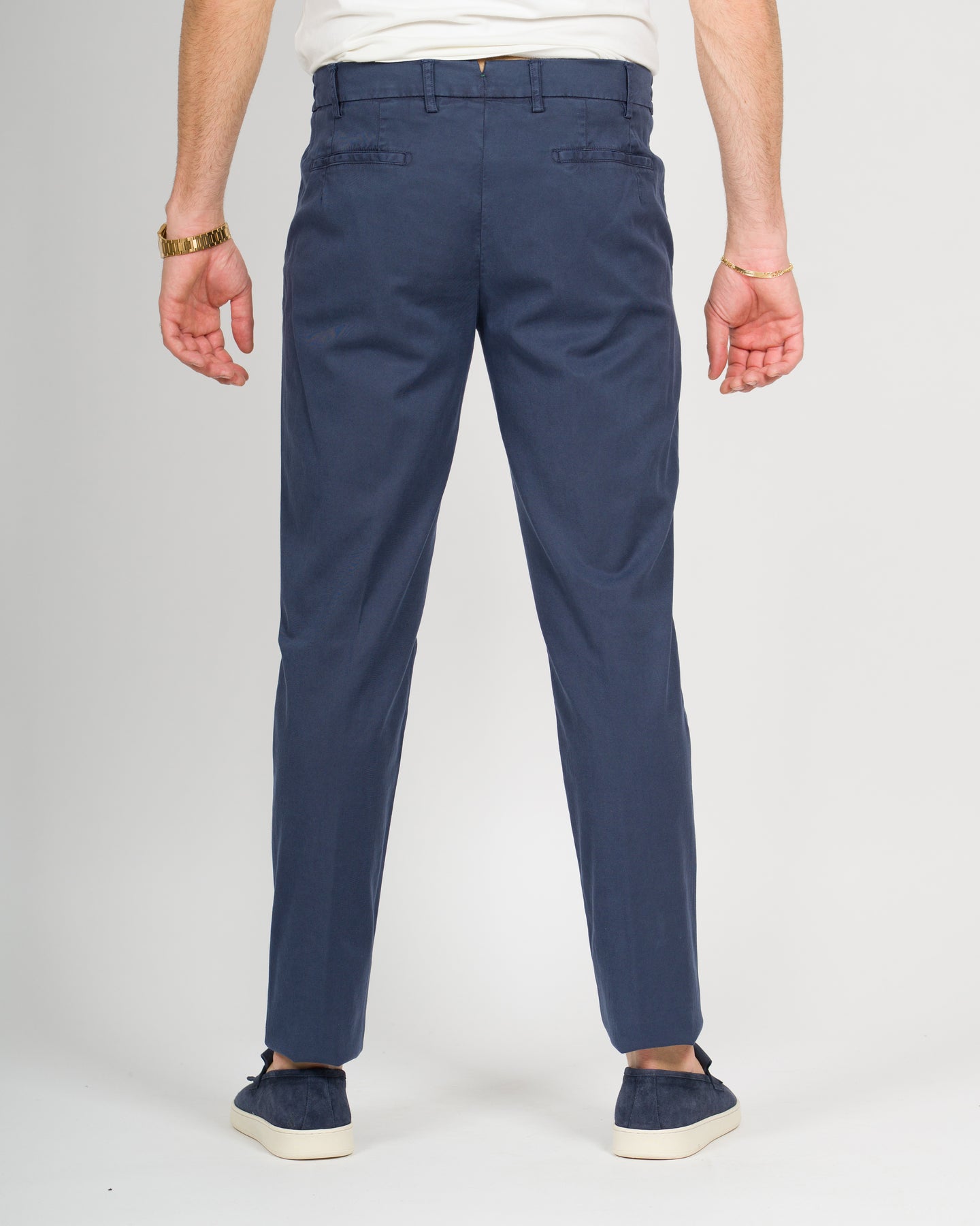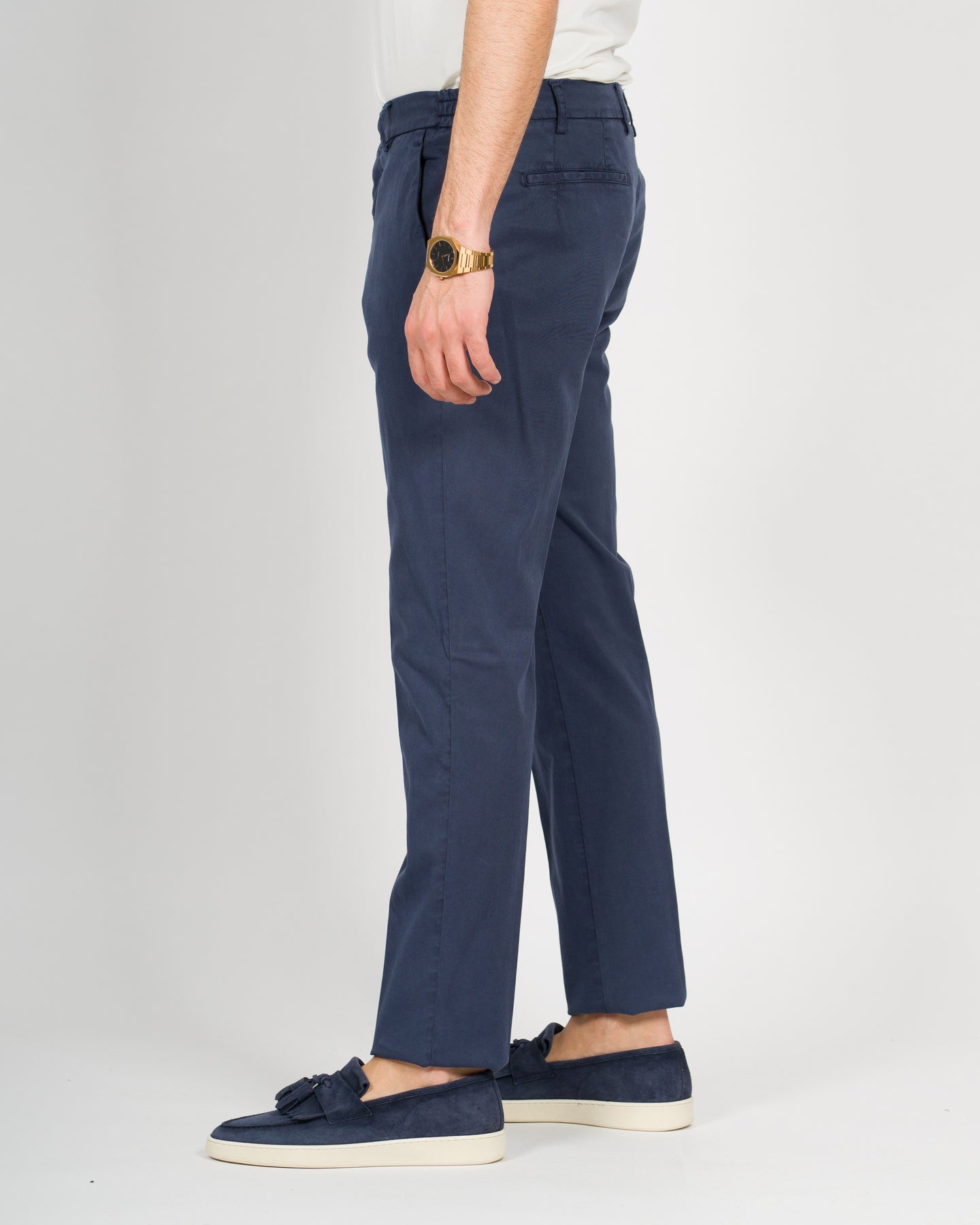 Pantalone in tessuto cotone gabardine con tasca america e vestibilità slim con fondo 17.Il modello è alto 1,90 e indossa la taglia 48.