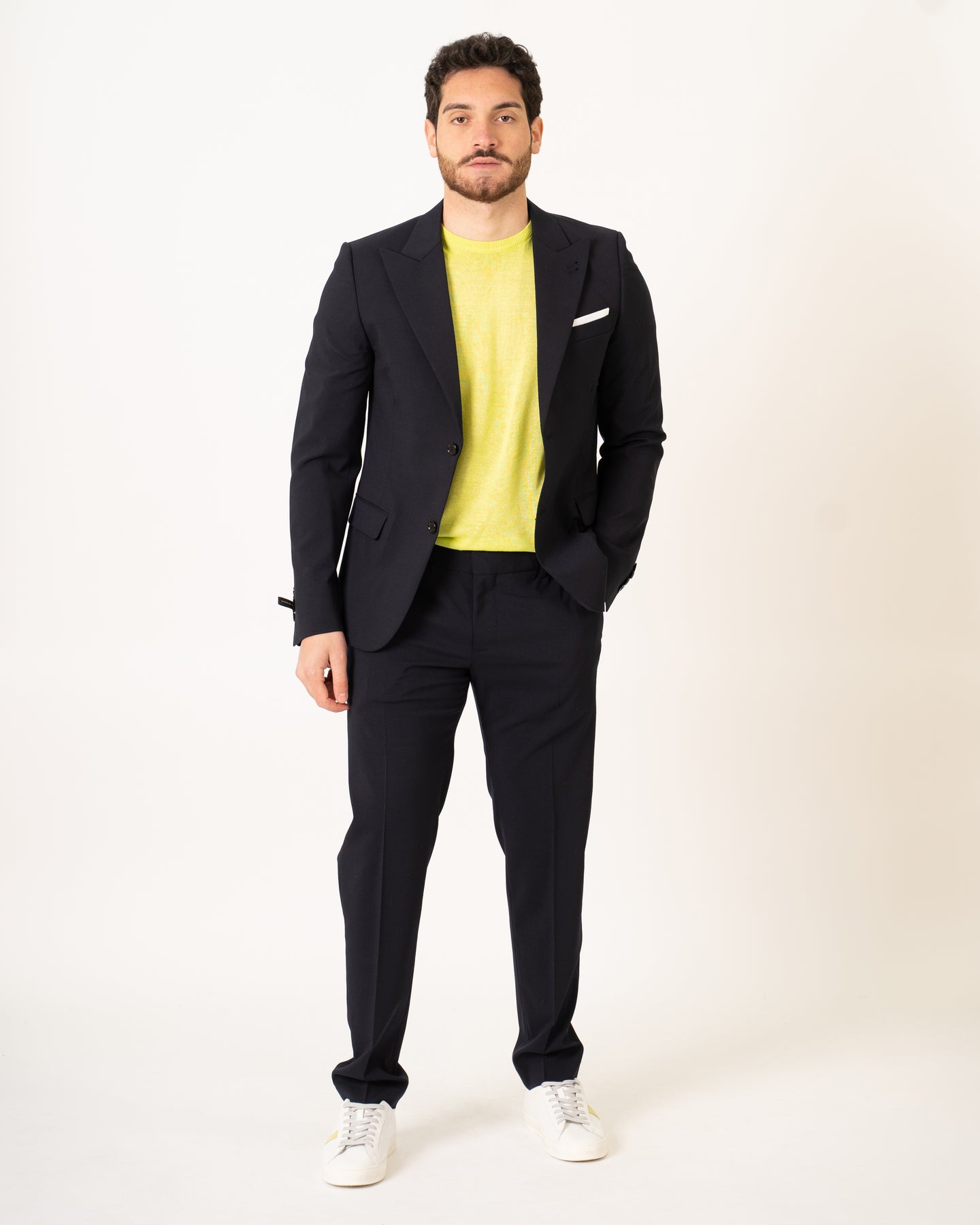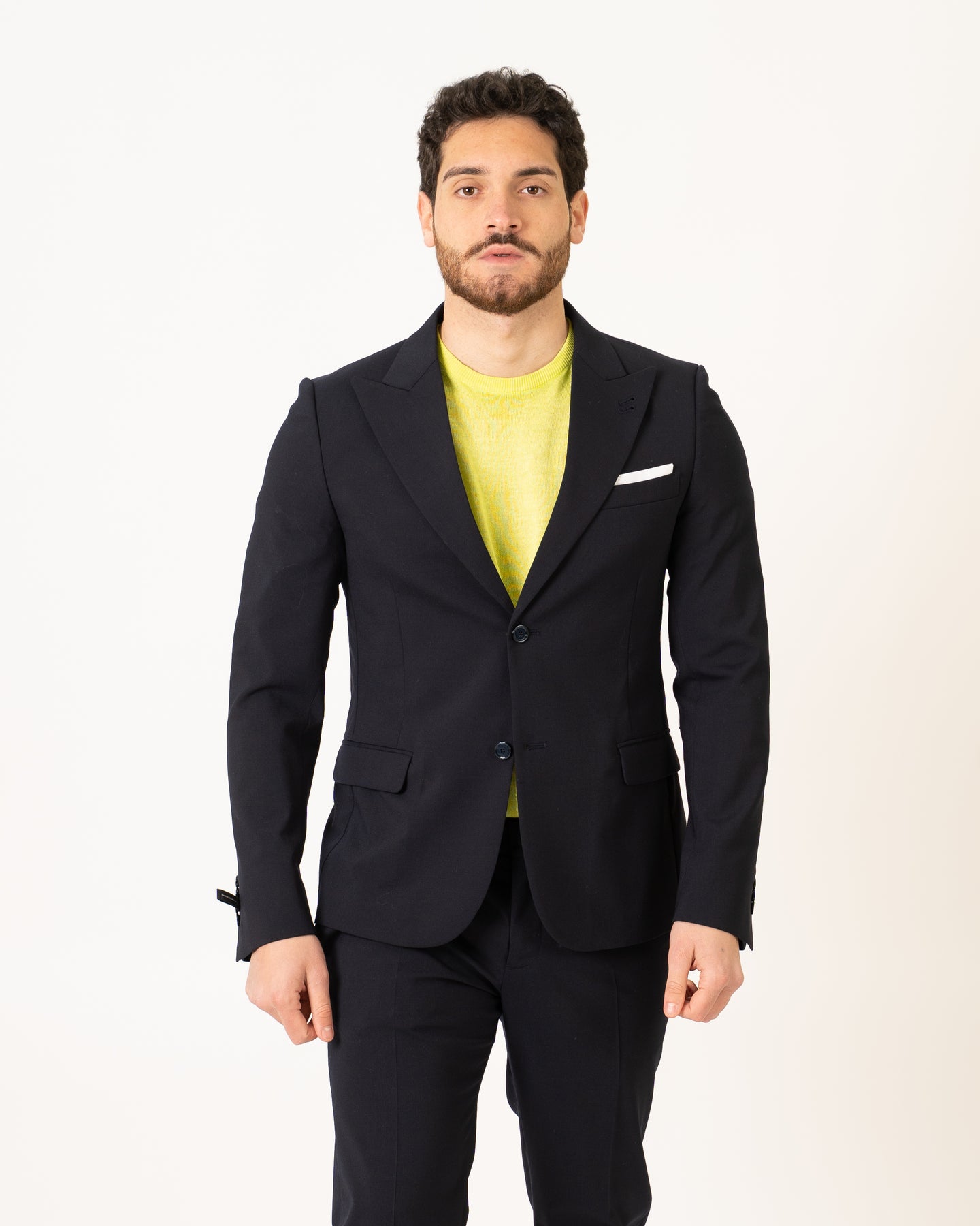Single-breasted blazer in cool color wool fabric with peaked chest. We recommend trousers in the same fabric to complete the suit.