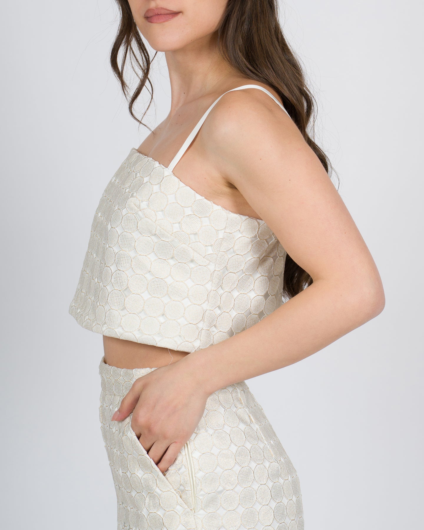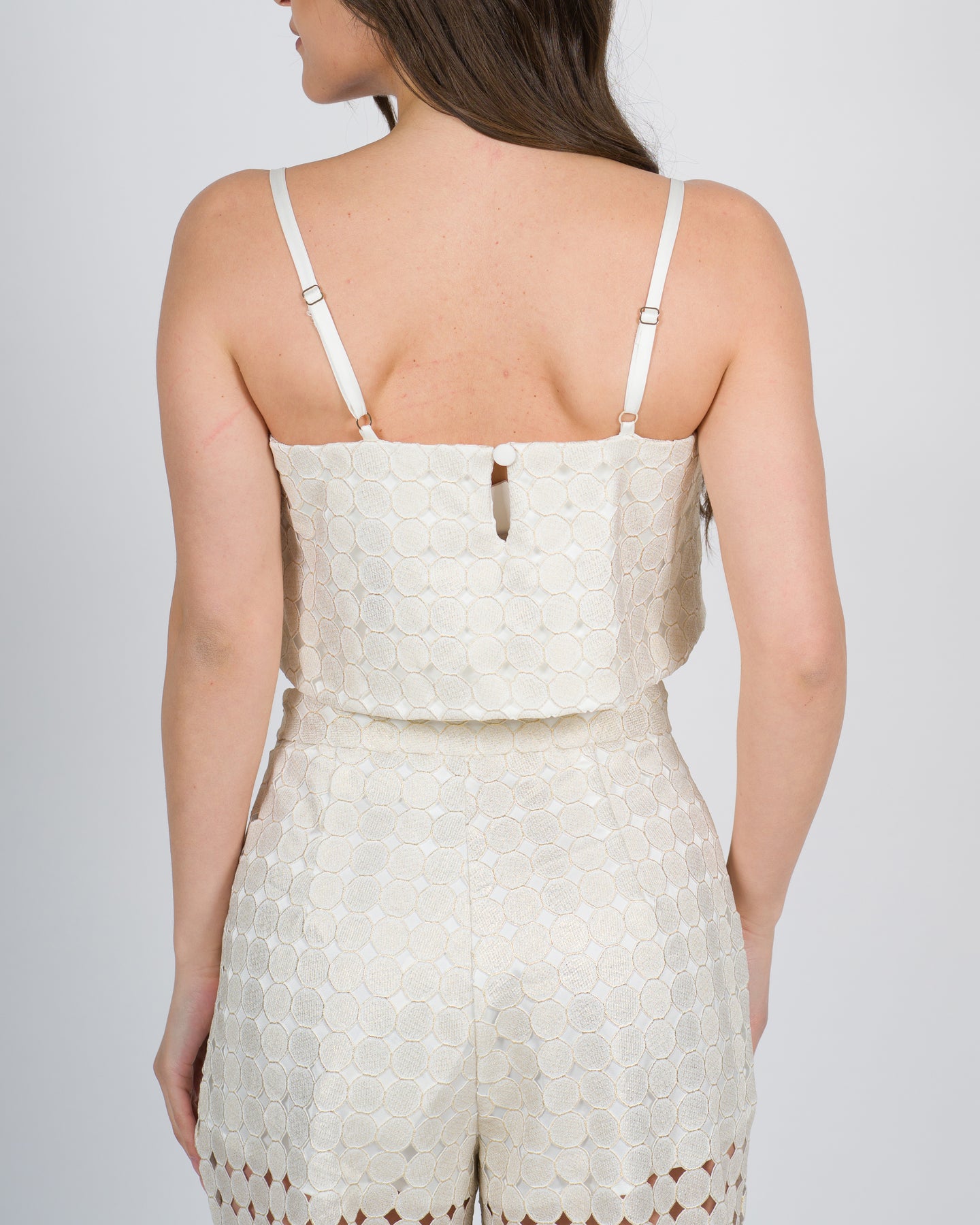 Questo top corto con spalline sottili è un capo dal fascino ricercato. Il tessuto doppio sovrapposto gli conferisce una vestibilità confortevole e un effetto strutturato, l'originale lavorazione a cerchi crea un raffinato gioco di trasparenze.-Caratteristiche principali: Top corto con spalline sottili Tessuto doppio in sovrapposizione Lavorazione traforata a cerchi Bordature dorate sui cerchi-Composizione: 100% poliestere.