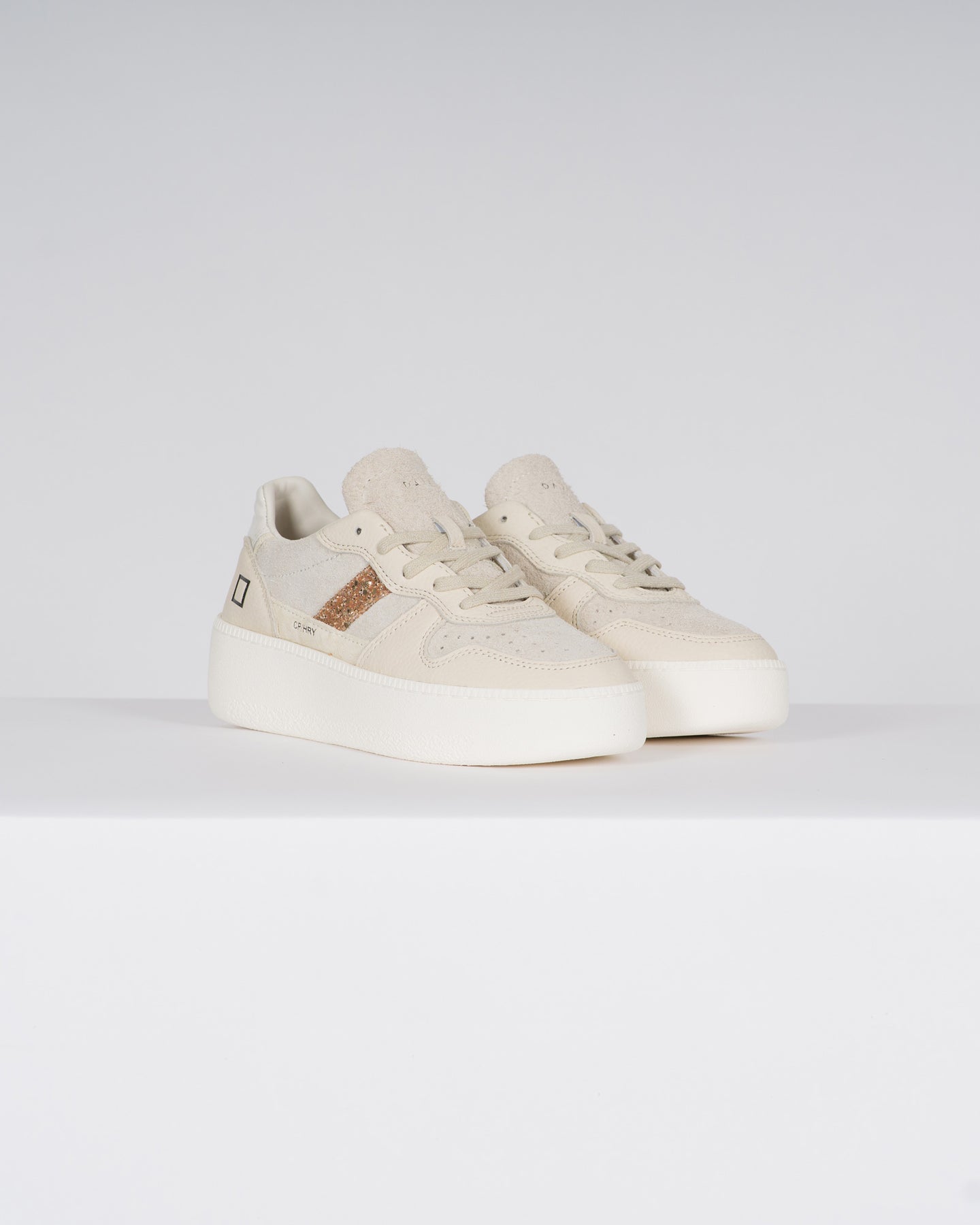 Sneakers platform in suede hairy colore beige e pelle martellata in tono.-Sulla linguetta in suede hairy è impressa la scritta D.A.T.E.-I lacci sono in cotone e il logo quadrato e il codice sono impressi lateralmente.-La banda laterale è in glitter colore bronzo.-Il talloncino posteriore è in pelle lucida colore panna.-Fodera in pelle e spugna di cotone.-Il soletto interno è rialzato di 2.5 cm per un miglior comfort.-La suola platform in gomma, alta 3.5 - 4.5 cm, è cucita.-Tutti i materiali selezionati sono Made in Italy.-Vestibilità: REGULAR