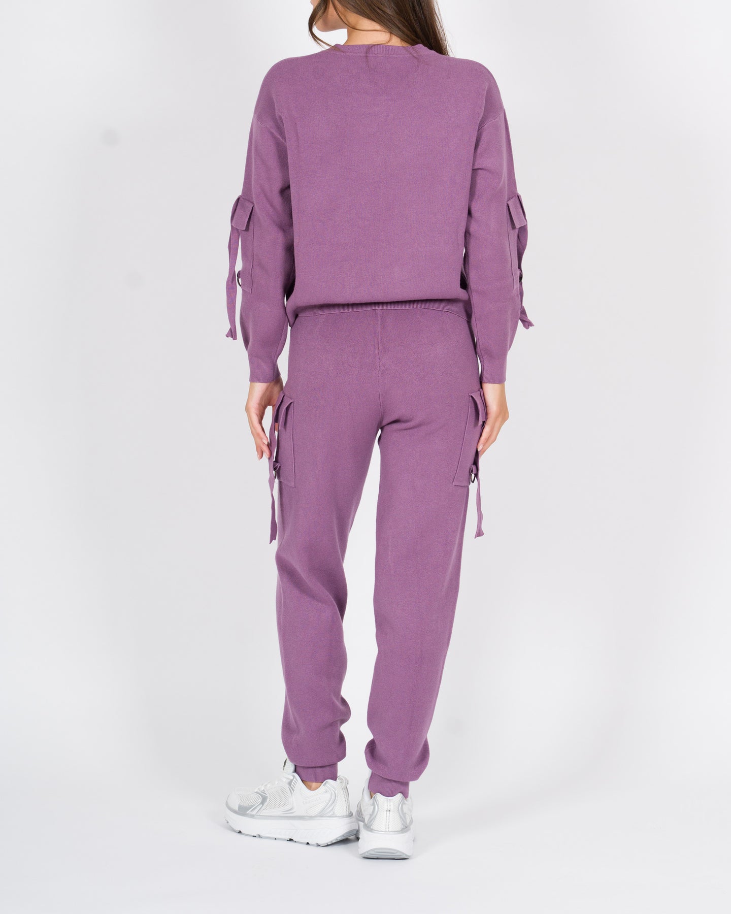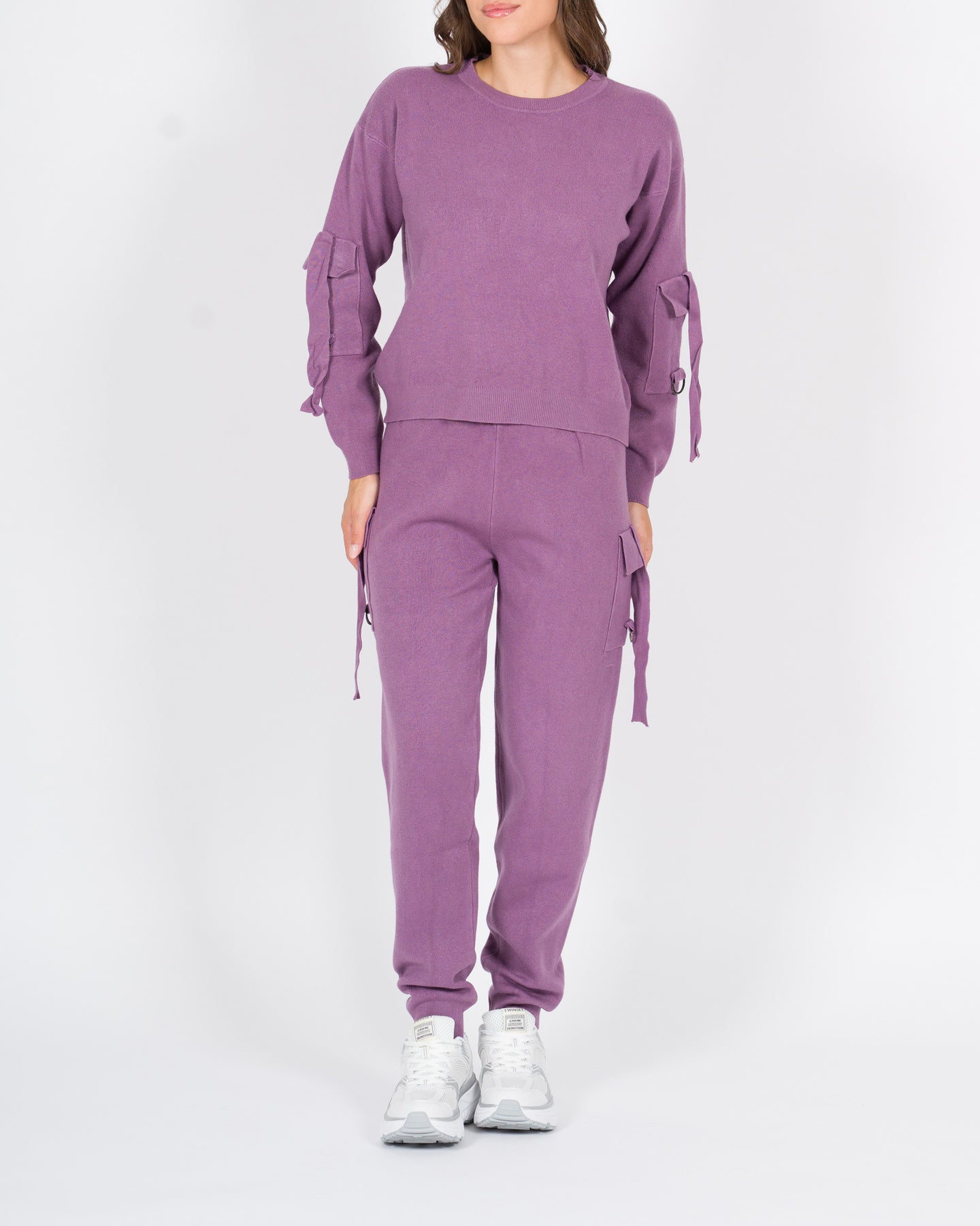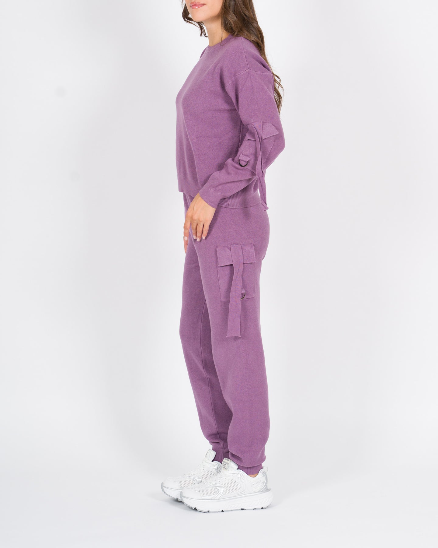 Completo coordinato in morbido tessuto di viscosa, composto da maglia a manica lunga e pantalone dal taglio rilassato, perfetto per un look moderno e ricercato.La maglia presenta un design originale con lacci decorativi lungo le braccia, che aggiungono un tocco grintoso e femminile. Il pantalone è caratterizzato da lacci regolabili sulle gambe e polsini al fondo, che donano struttura e movimento al capo.Un outfit versatile, comodo ma d'impatto, ideale sia per il tempo libero che per occasioni più urban-chic.Dettagli tecnici:Tessuto: viscosaLacci su maglia e pantaloniColore: melanzanaLa modella indossa la taglia S/M ed è alta 1.70