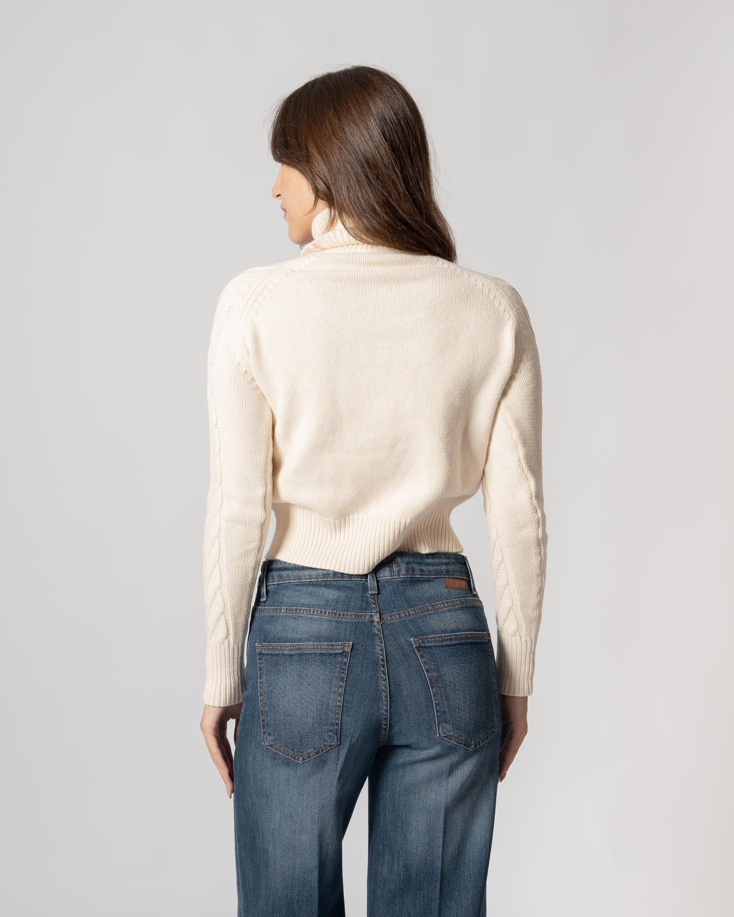Maglia collo alto manica lunga in tessuto lana e viscosa con lavorazione spigata e lunghezza alla pancia.