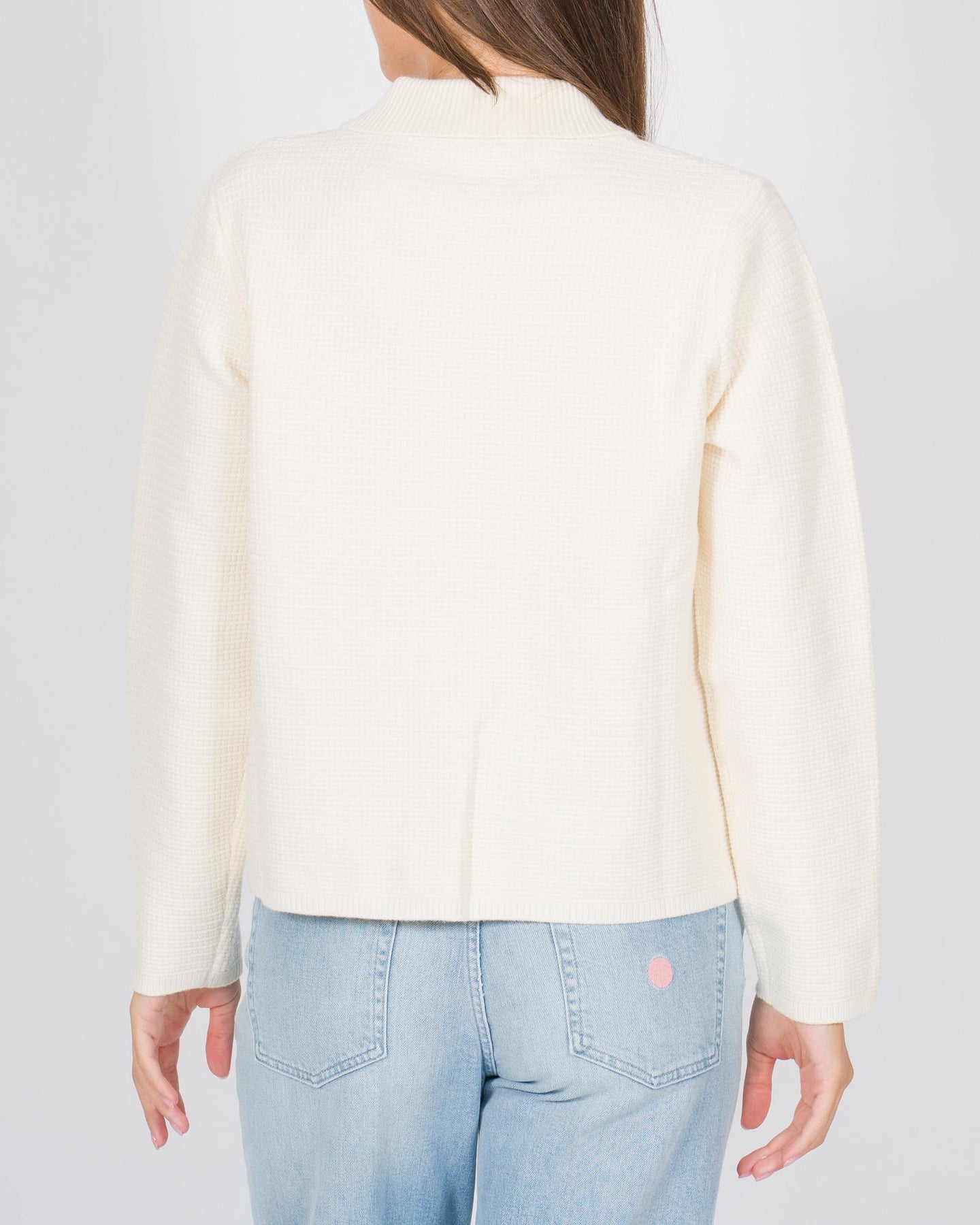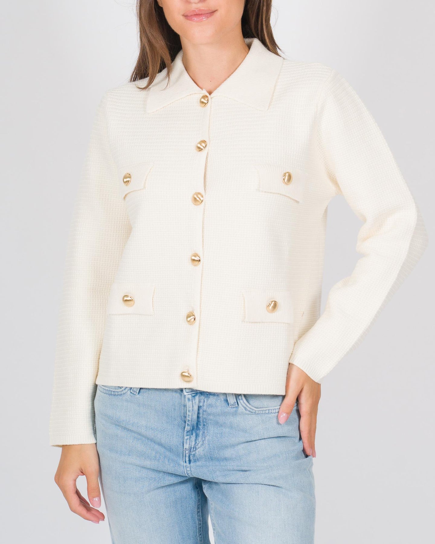 This wool knit jacket stands out for its popcorn stitch, which adds a three-dimensional and refined touch to the garment. The design is completed by a shirt collar and a front closure with golden buttons, a detail that adds brightness and a sophisticated touch. The faux patch pockets emphasize the clean lines, while the updated fit and long sleeves make it a versatile choice, ideal to pair with both casual chic looks and more elegant outfits.