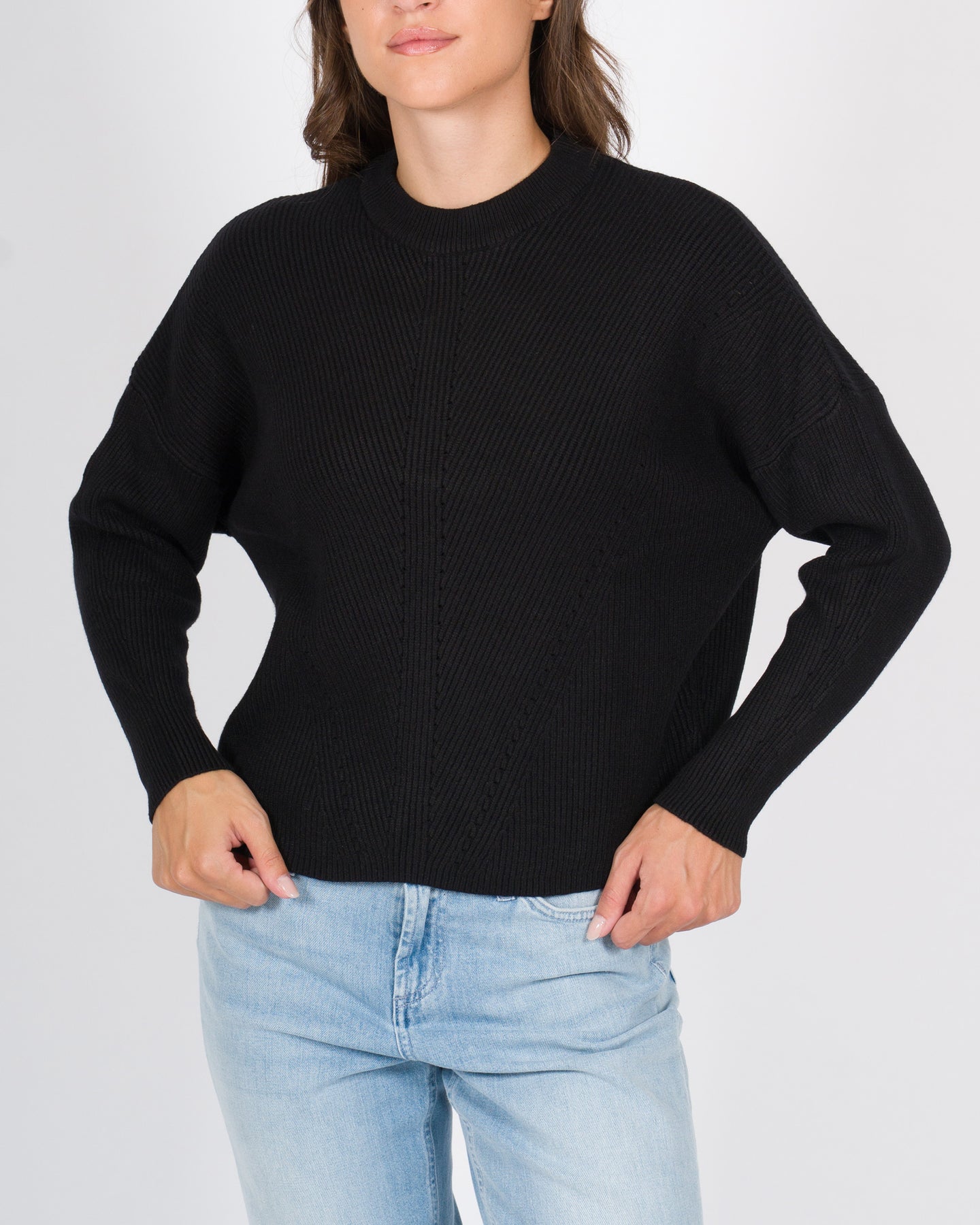Maglia manica lunga realizzata in viscosa con lavorazione a costine, che dona texture e leggerezza al capo. Il girocollo classico e la vestibilità regolare, la rendono un capo versatile e confortevole, perfetto sia per look casual che più curati.Dettagli tecnici:Lavorazione a costine Manica lunga Tessuto: viscosaColore: neroLa modella indossa la taglia S/M ed è alta 1.70
