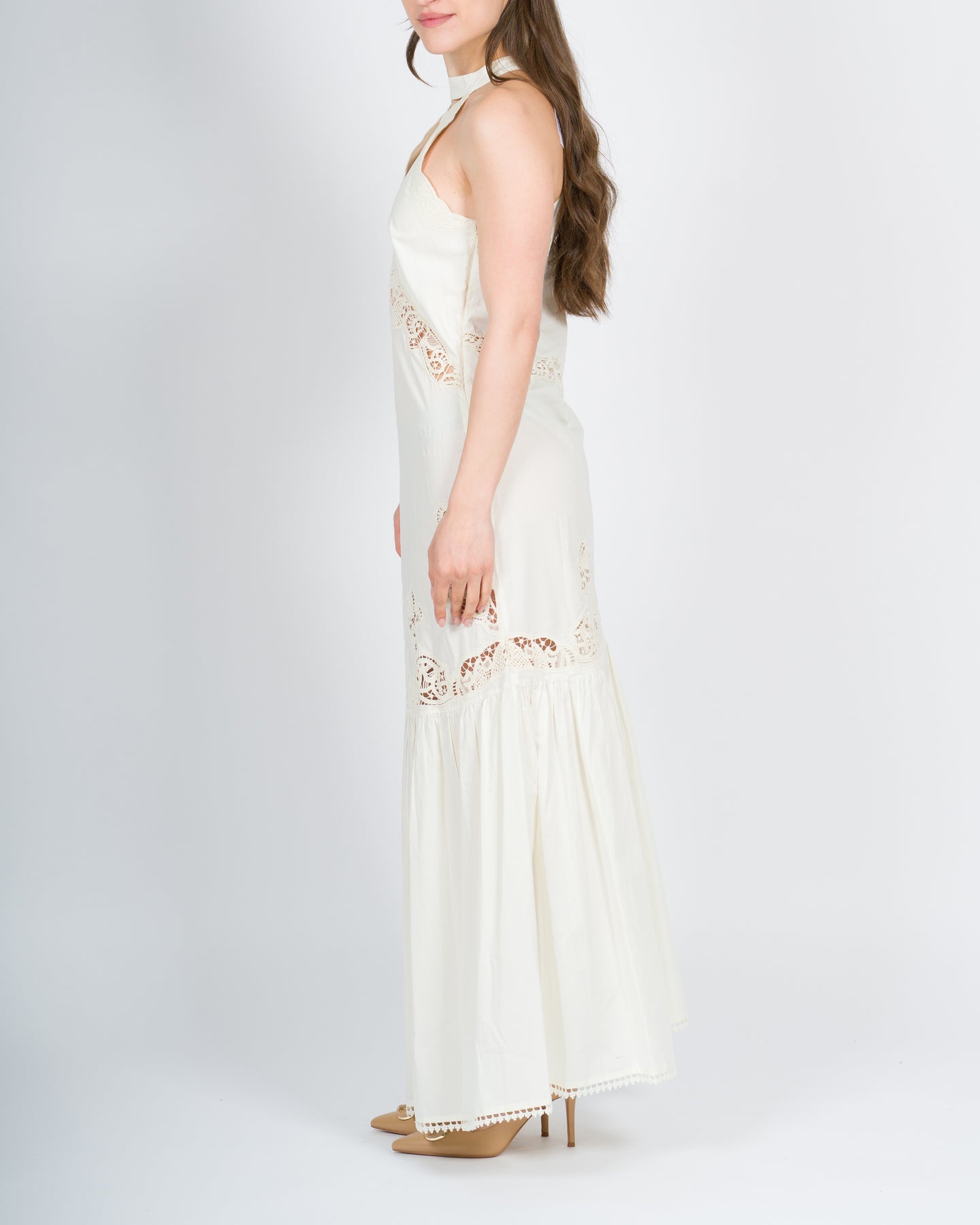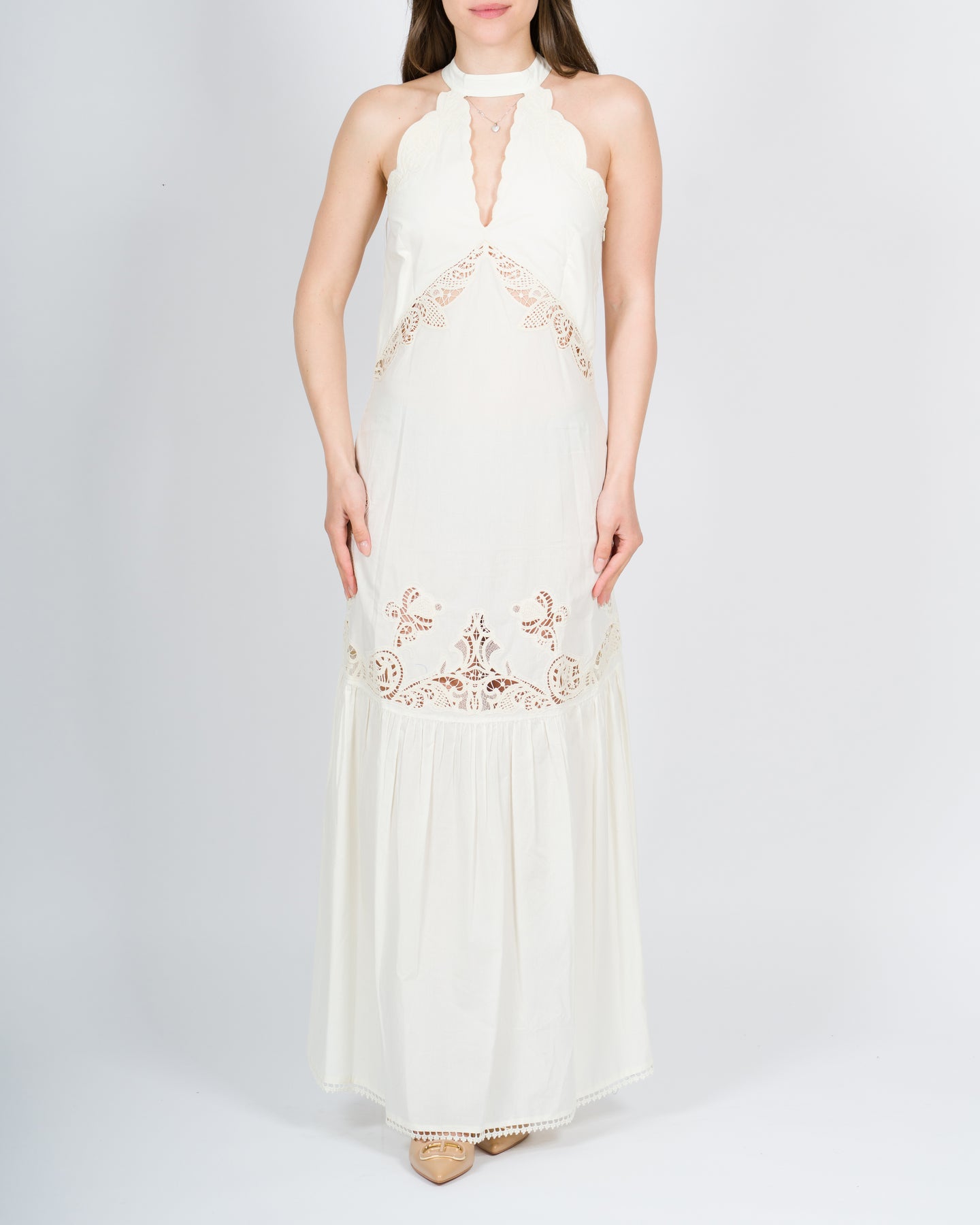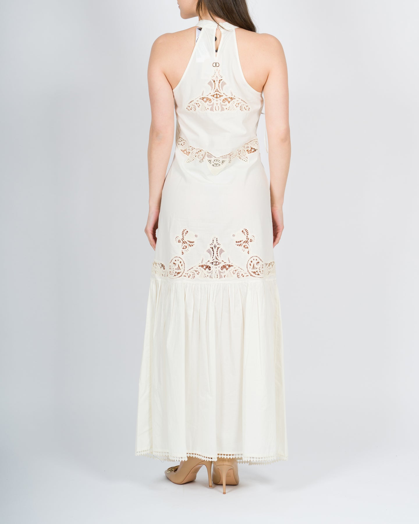 Abito lungo in cotone con ricami piazzati intarsiati in filo. Ha scollo halter e giromanica smerlati rifiniti da ricamo, balza arricciata, fondo rifinito da passamaneria, chiusura con zip al fianco, placchetta logo Oval T sul retro, linea leggermente svasata.