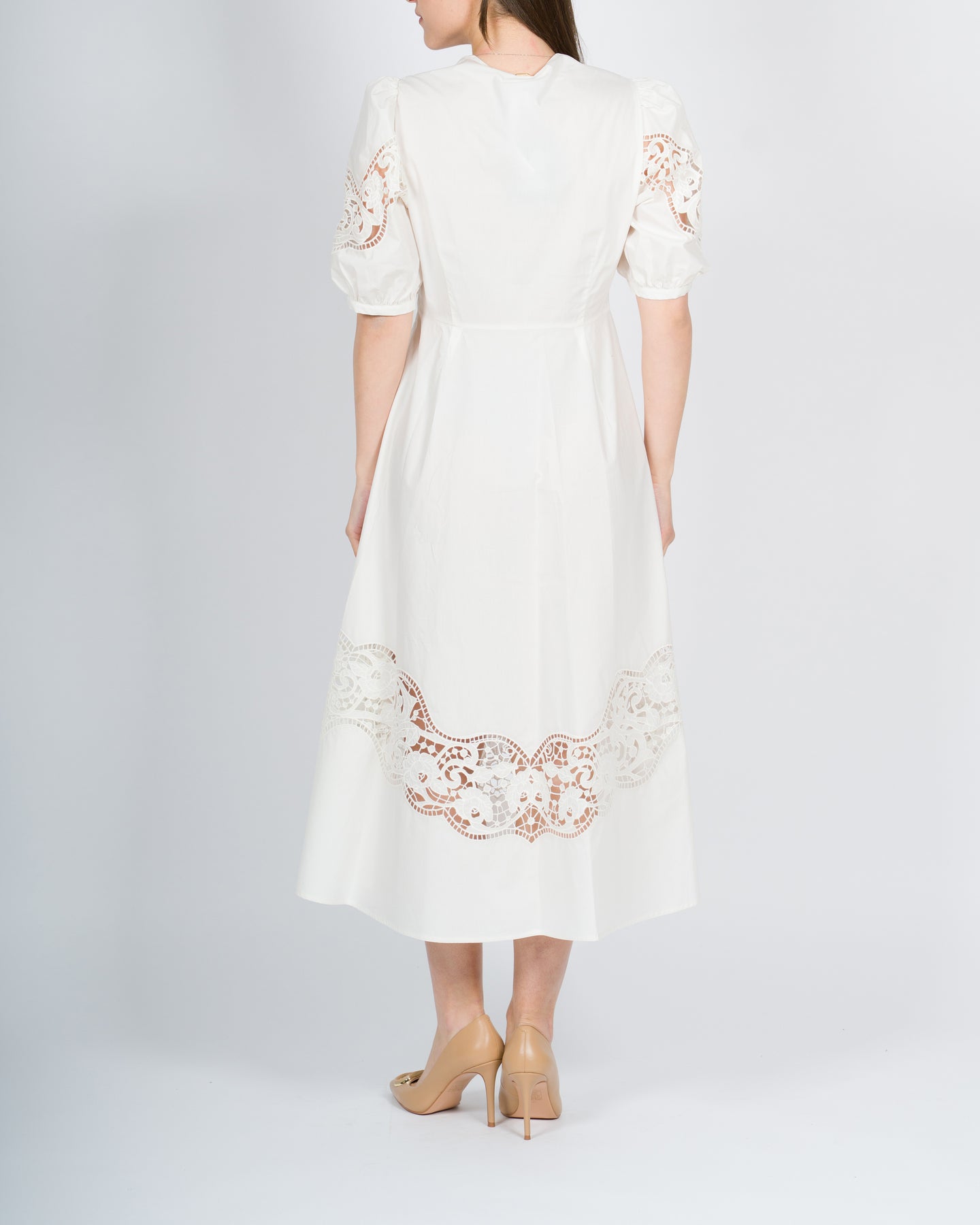 Abito lungo in popeline di cotone con ricami sangallo piazzati su maniche e fondo. Ha scollatura a V, maniche corte a palloncino con arricciatura, taglio in vita, chiusura con zip al fianco, placchetta logo Oval T sul retro, linea svasata.