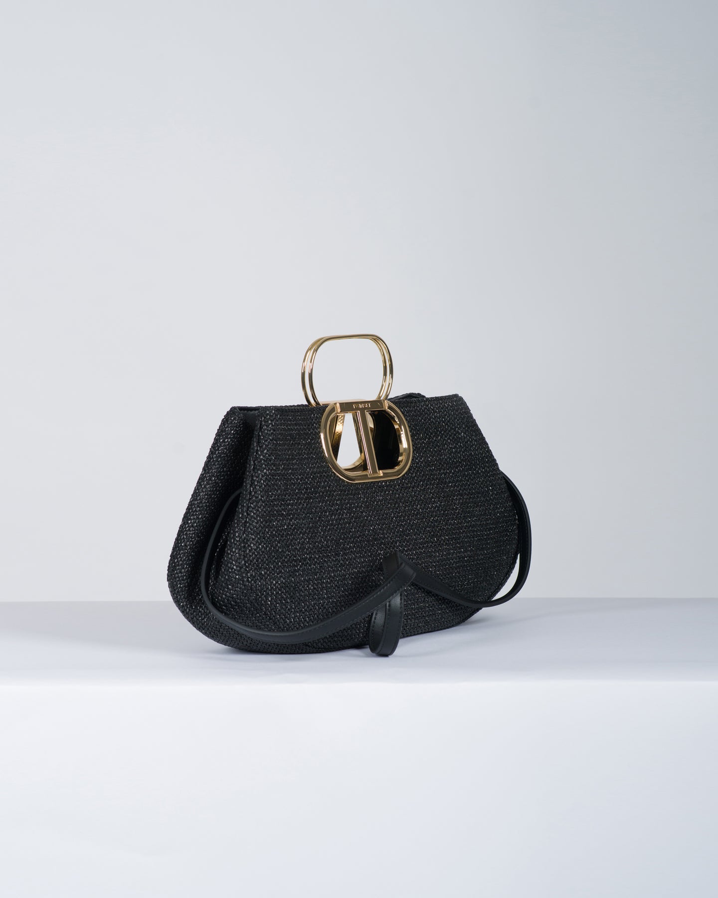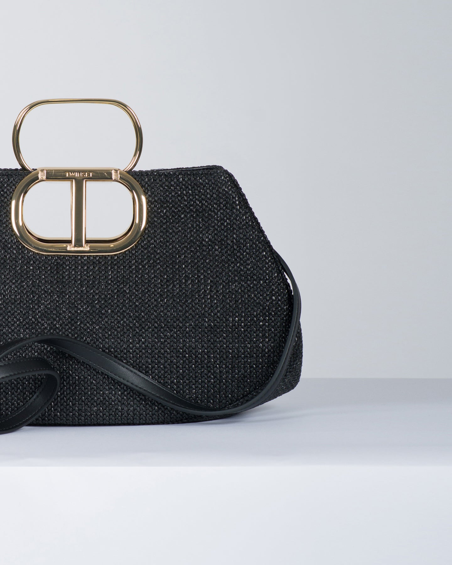 Borsa a tracolla 'Lila' morbida effetto paglia intrecciata a telaio con manico Oval T in metallo. Ha chiusura con magnete, tracolla regolabile e rimovibile, accessori in galvanica color oro, foderata. All'interno del logo sono presenti due anelli che si possono ruotare verso l'interno ed utilizzare come ulteriori manici.-Ampiezza 34 cm, altezza 21 cm, profondità 9 cm. -Ampiezza manici 5,5 cm. -Lunghezza tracolla 53 cm100% polipropilenica. Fodera: 100% poliestere. -Materiale 2: 100% poliuretanica