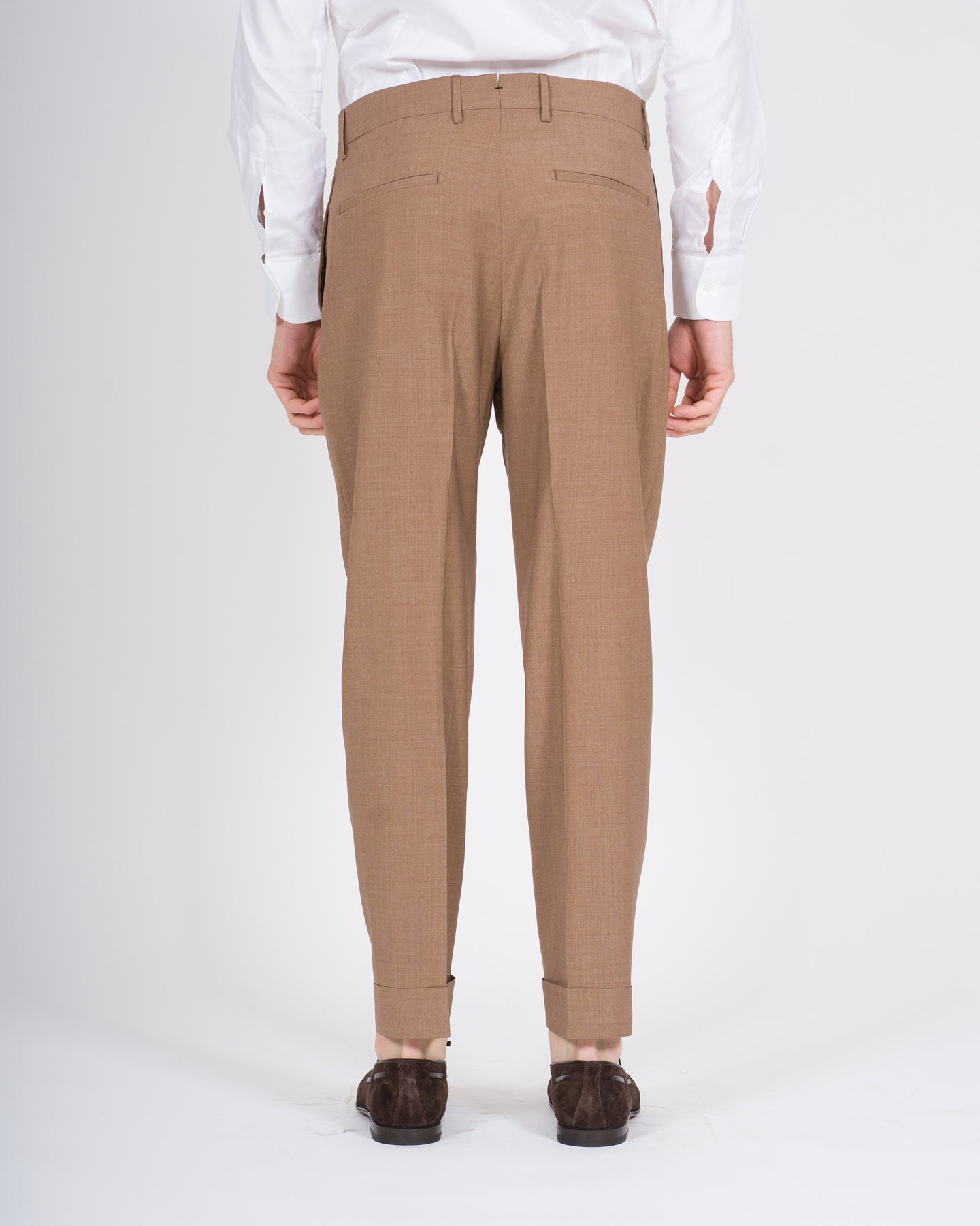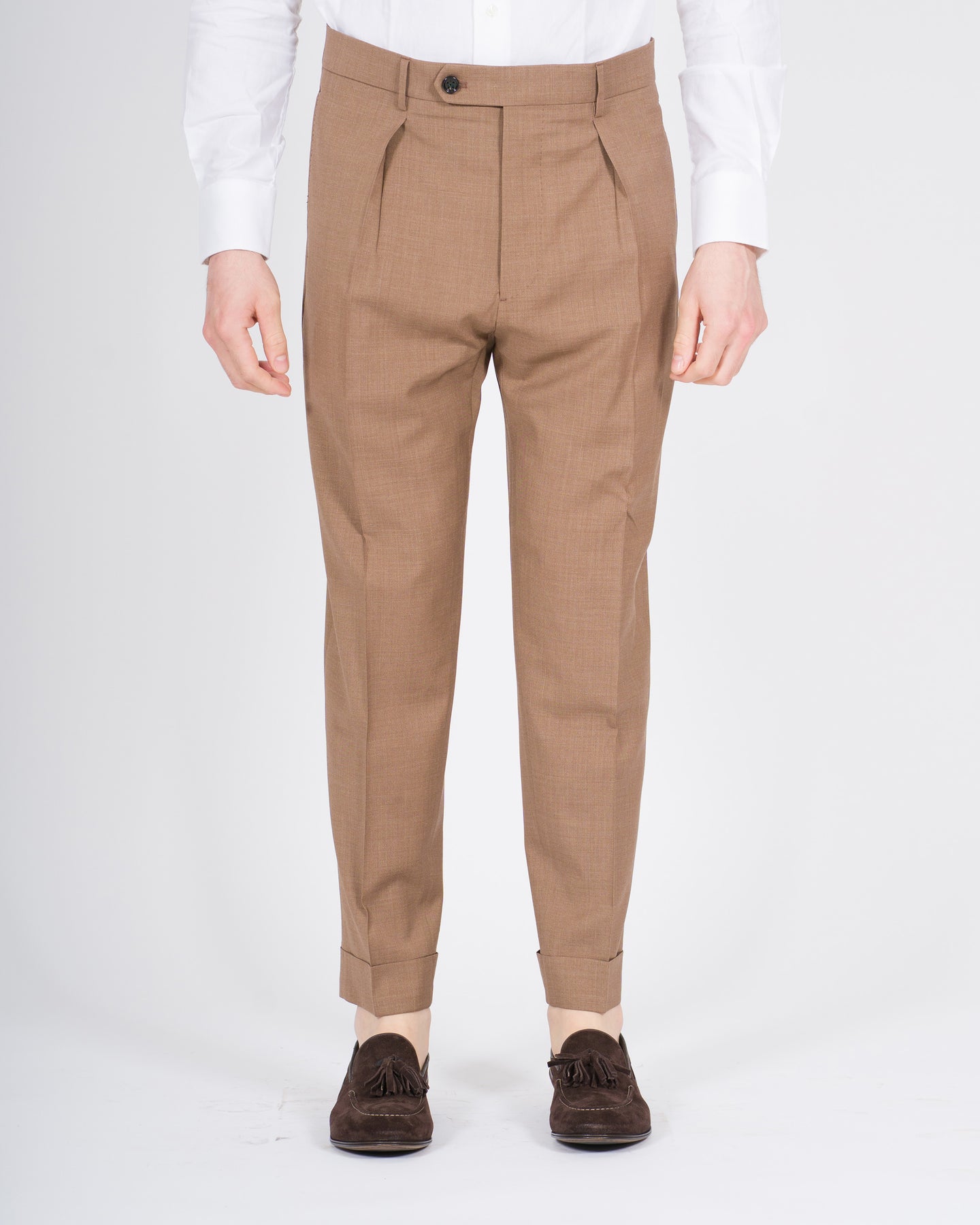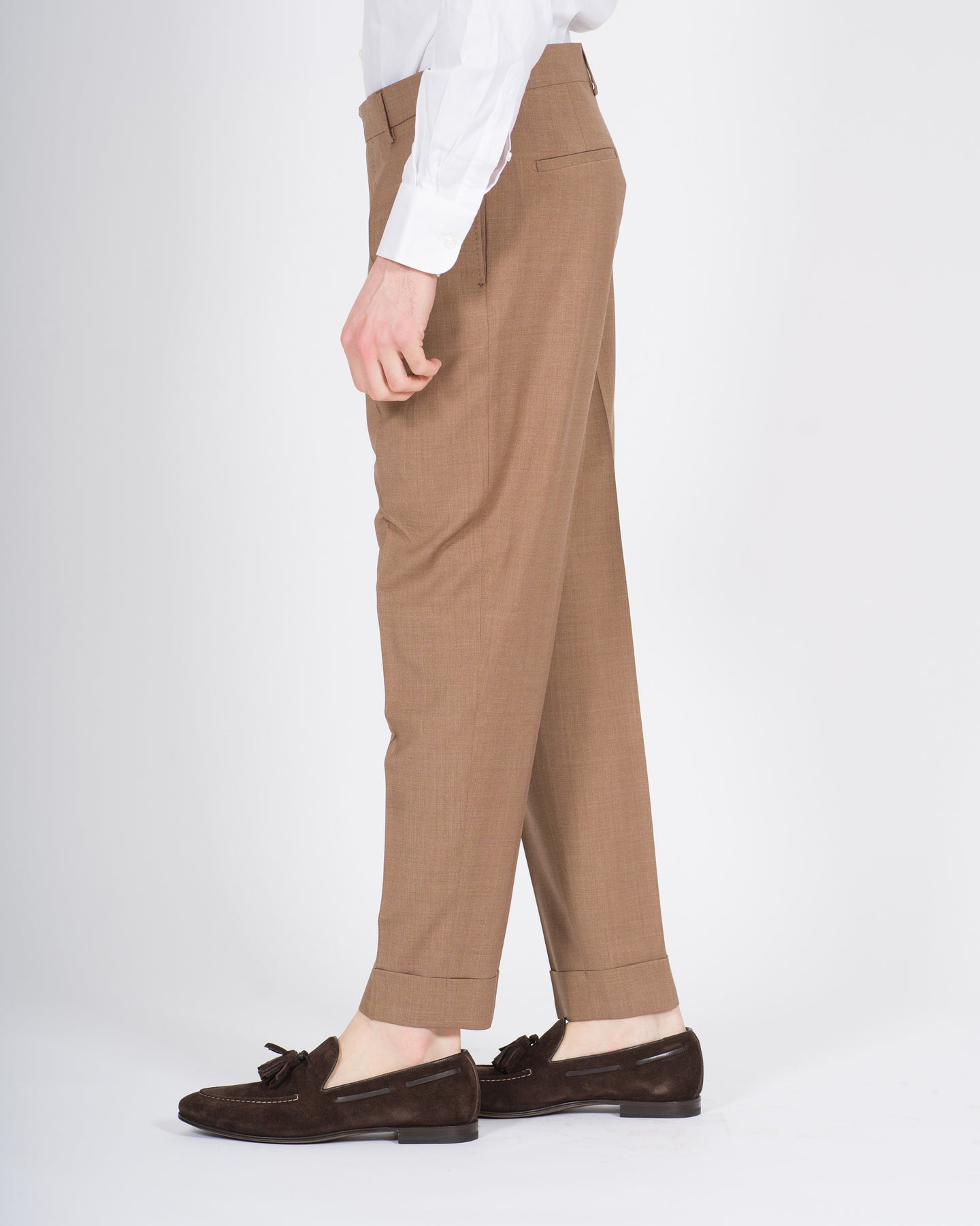 Il pantalone modello Chiaia Berwich fa parte della collezione Primavera Estate ed è pensato per l'uomo e la donna di Carillo Nola, interpretando uno stile sartoriale raffinato e contemporaneo. Un capo che unisce ricerca dei materiali, cura costruttiva e un'estetica senza tempo.Realizzato in pregiato tessuto Zegna, nella sofisticata tonalità tabacco, presenta una composizione in 70% lana e 30% viscosa, ideale per la stagione più calda grazie alla sua leggerezza, traspirabilità e fluidità. Il modello è caratterizzato da pence frontali, che definiscono la silhouette, e da risvolto sul fondo, dettaglio iconico della tradizione sartoriale italiana.Rispetto alla versione precedente, il pantalone Chiaia è stato allungato di 3 cm, offrendo una vestibilità più attuale ed equilibrata, perfetta per accompagnare look eleganti e casual sofisticati durante la stagione Primavera Estate.Un capo essenziale e distintivo, espressione dell'identità Berwich e dell'eccellenza del made in Italy.