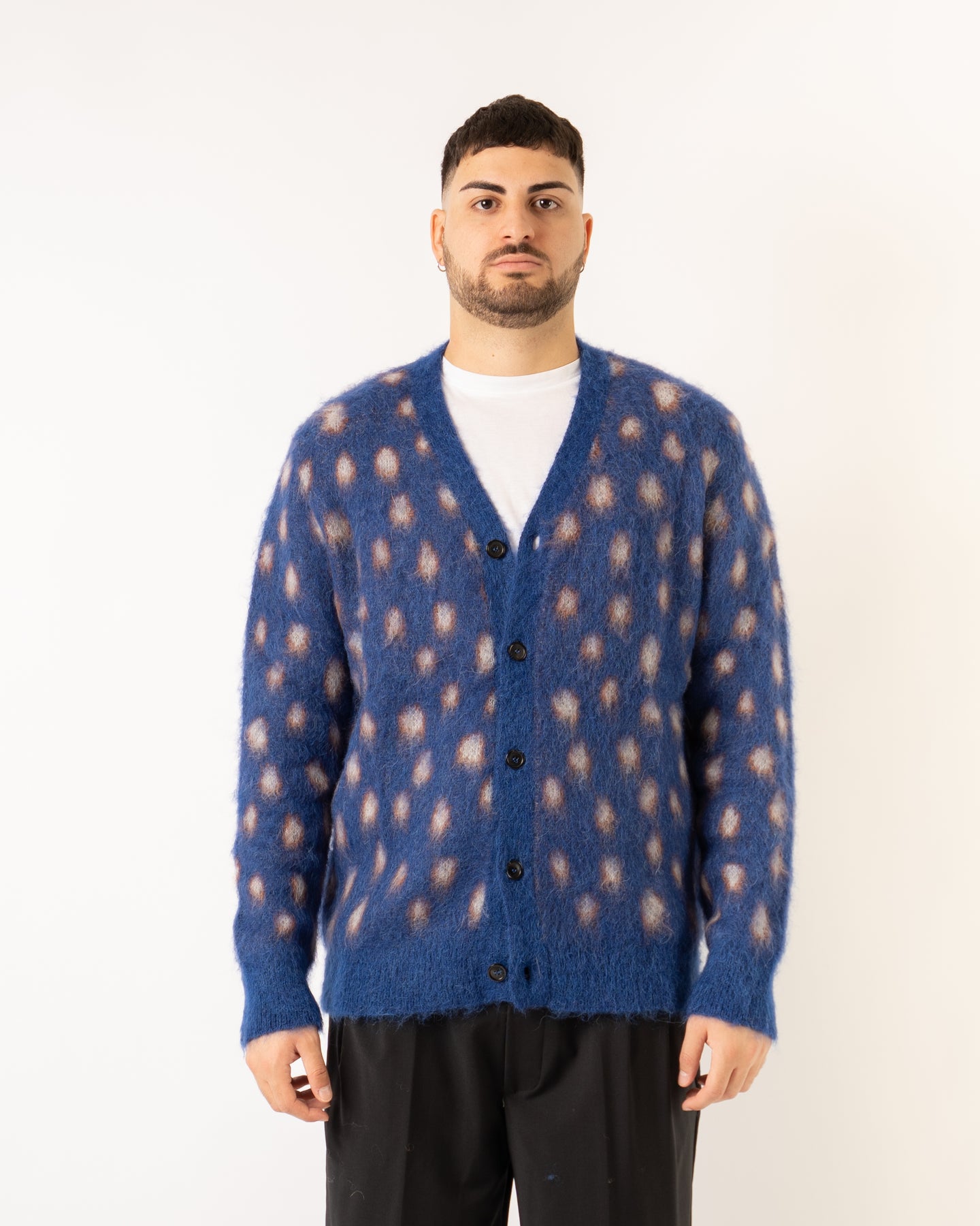 Cardigan in tessutro mohair bluette con fantasia bolle.