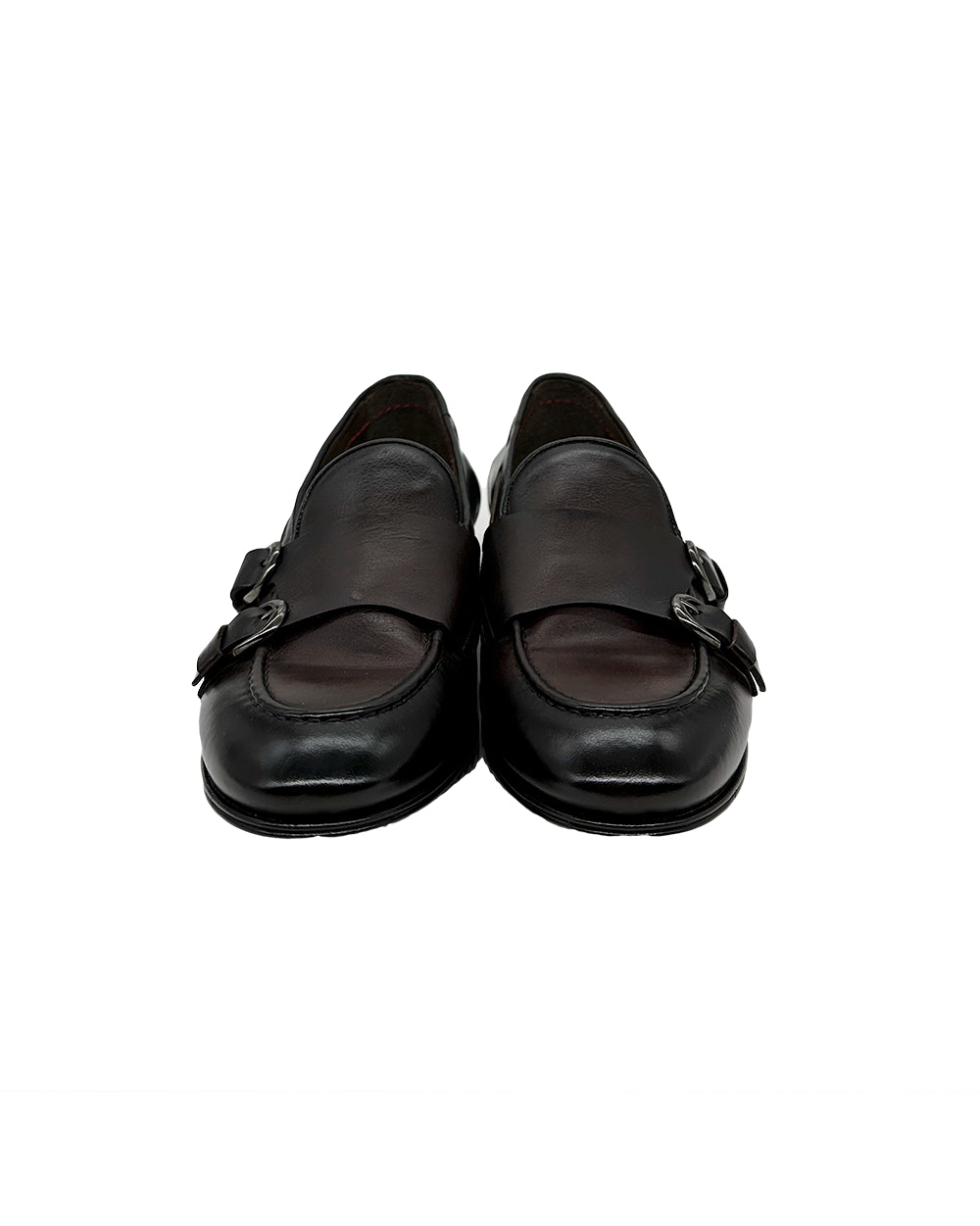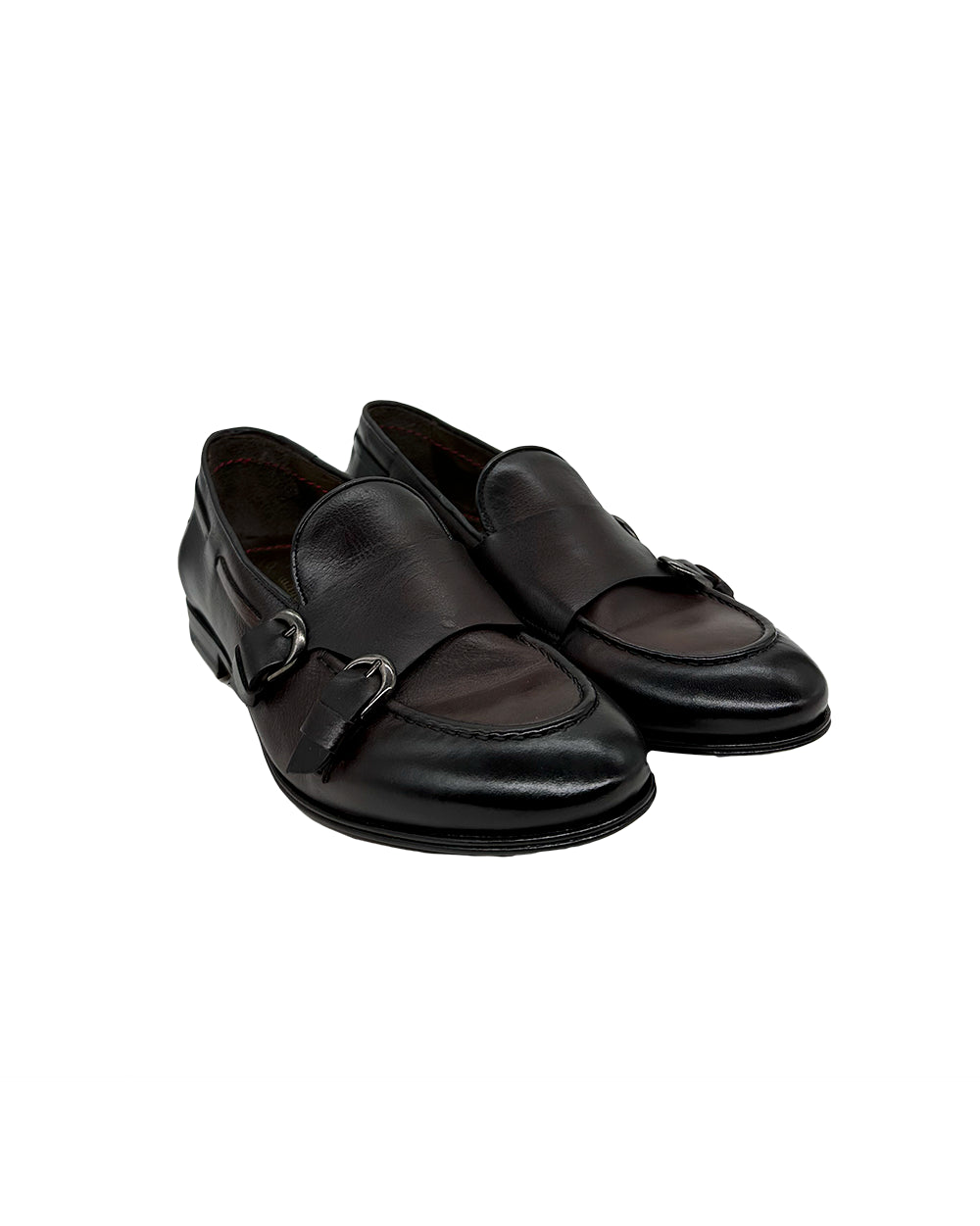 Moccasin in aged calfskin with double buckle.