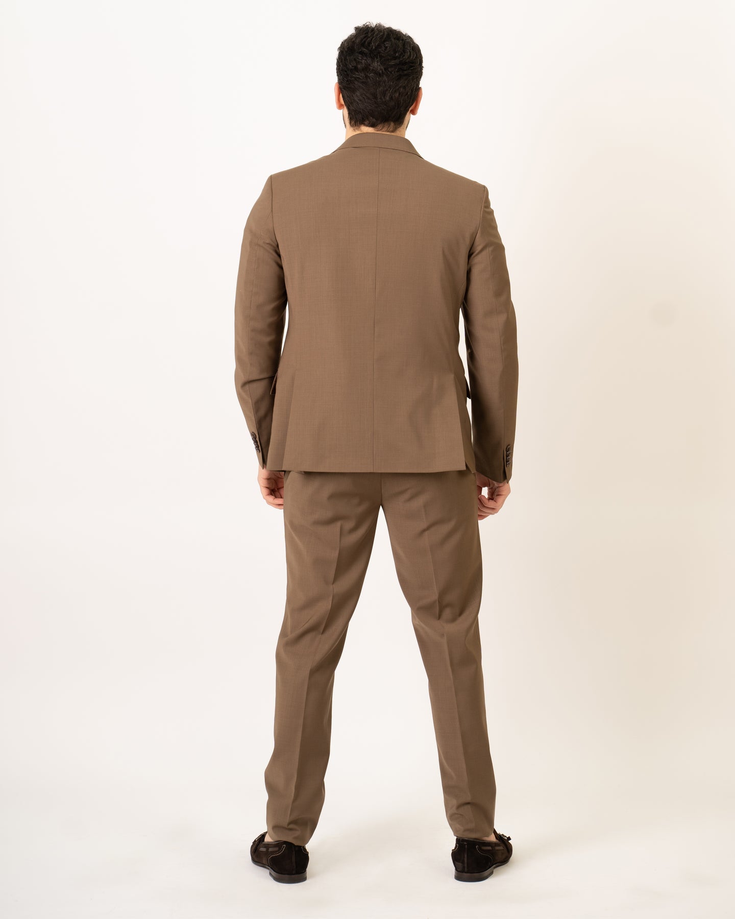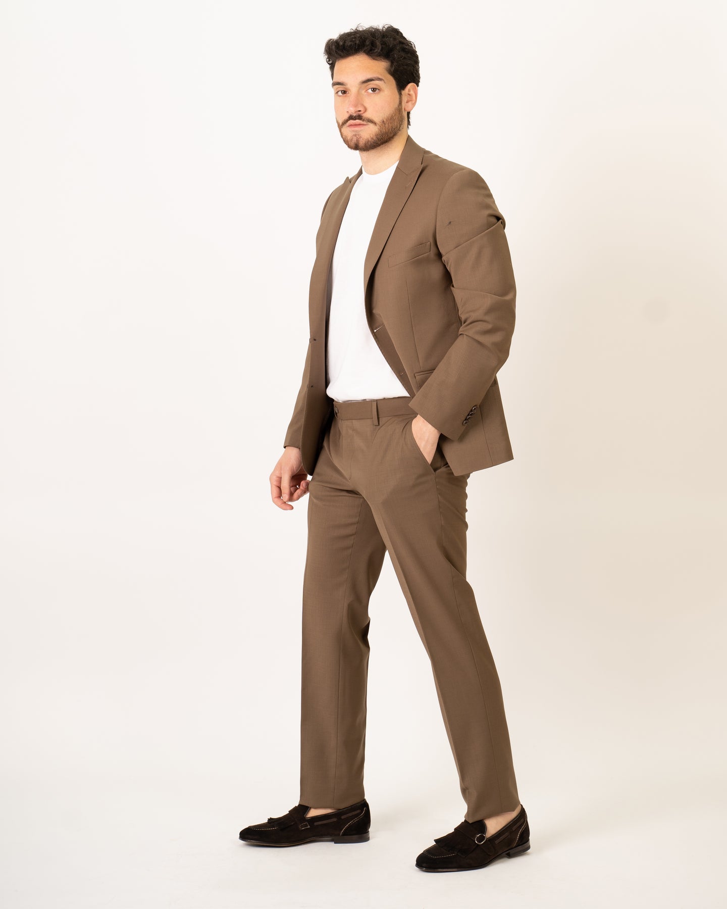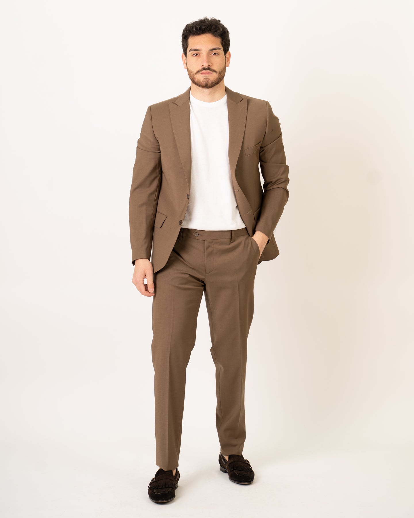 Single-breasted suit in cool wool fabric with peak lapels.