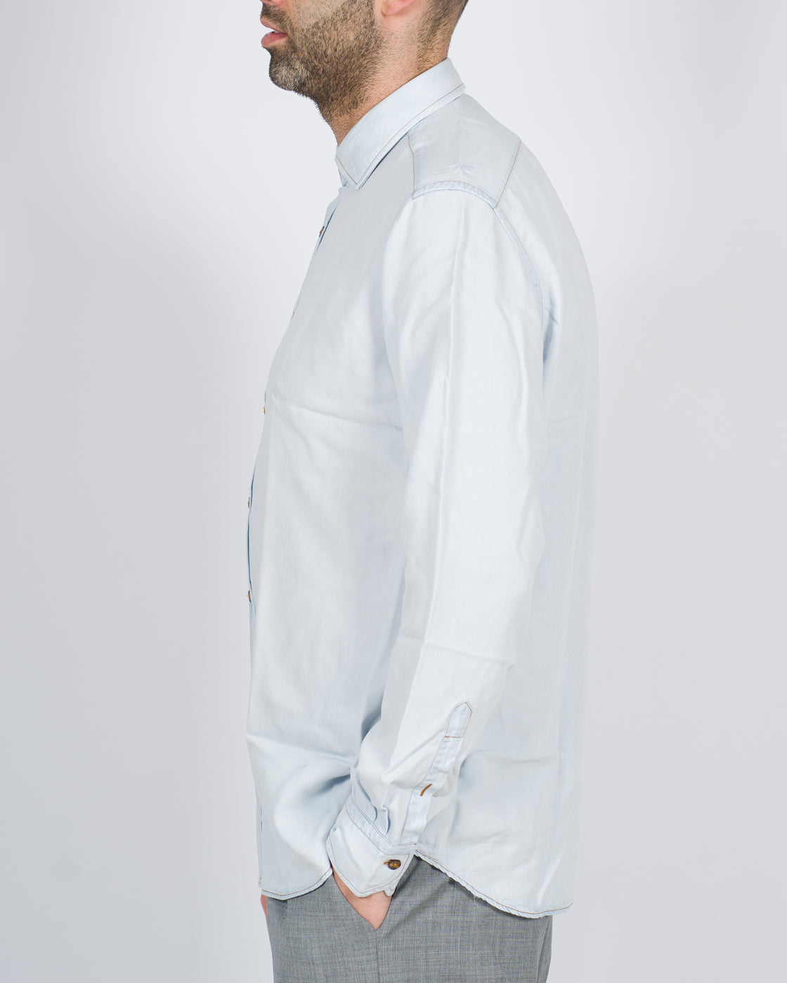 Camicia manica lunga con bottoni in contrasto effetto legno, impuntura a contrasto e vestibilità comoda (senza pence).Il modello è alto 1,90 e indossa la taglia L.