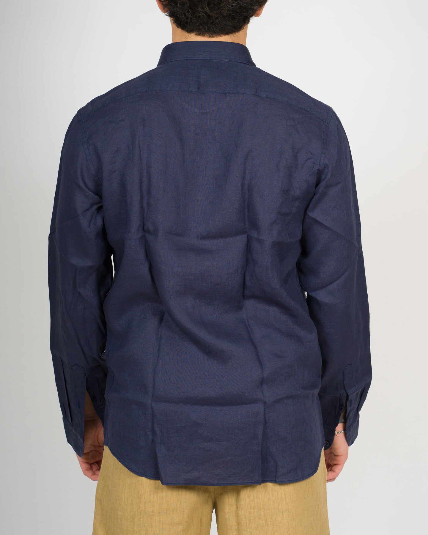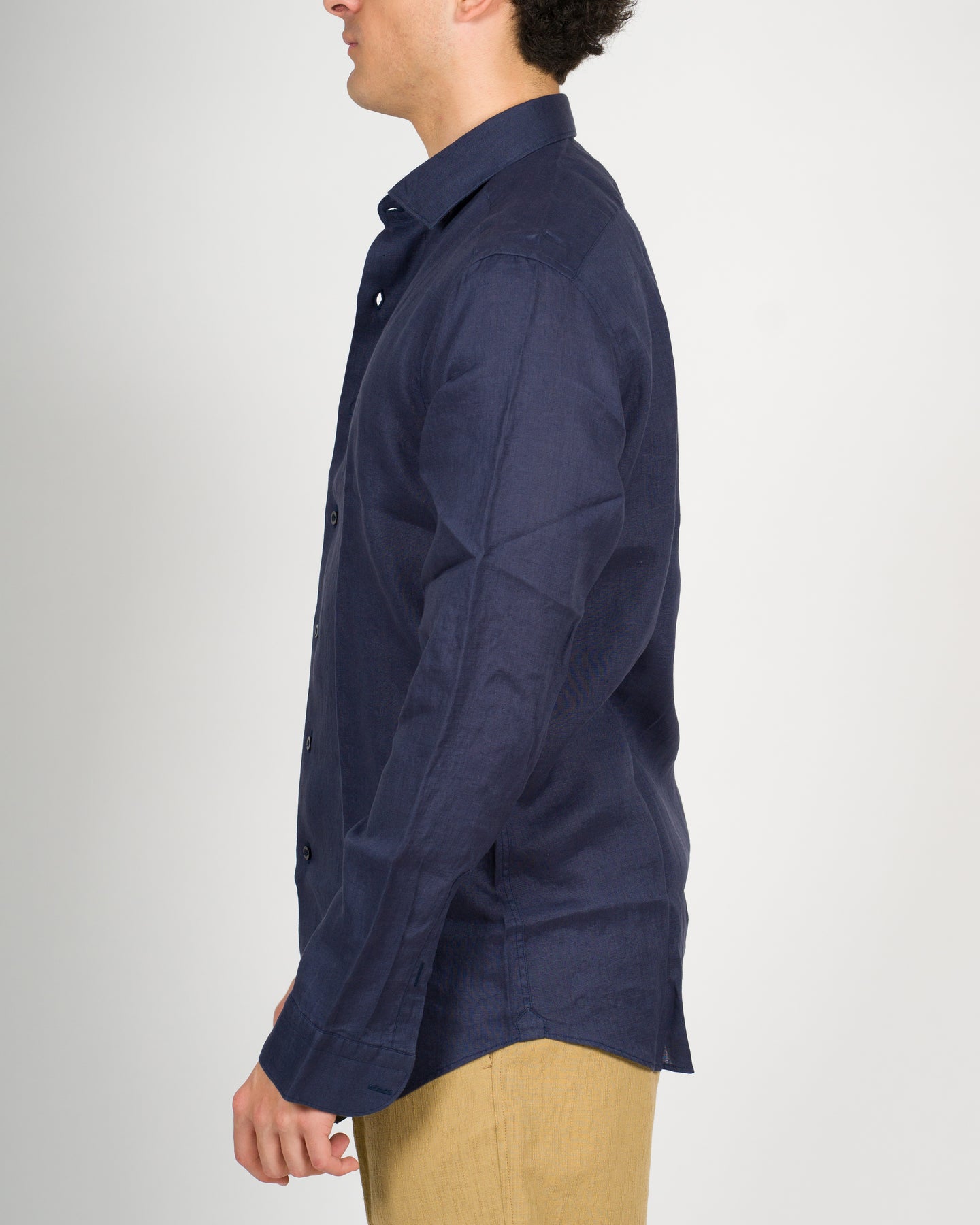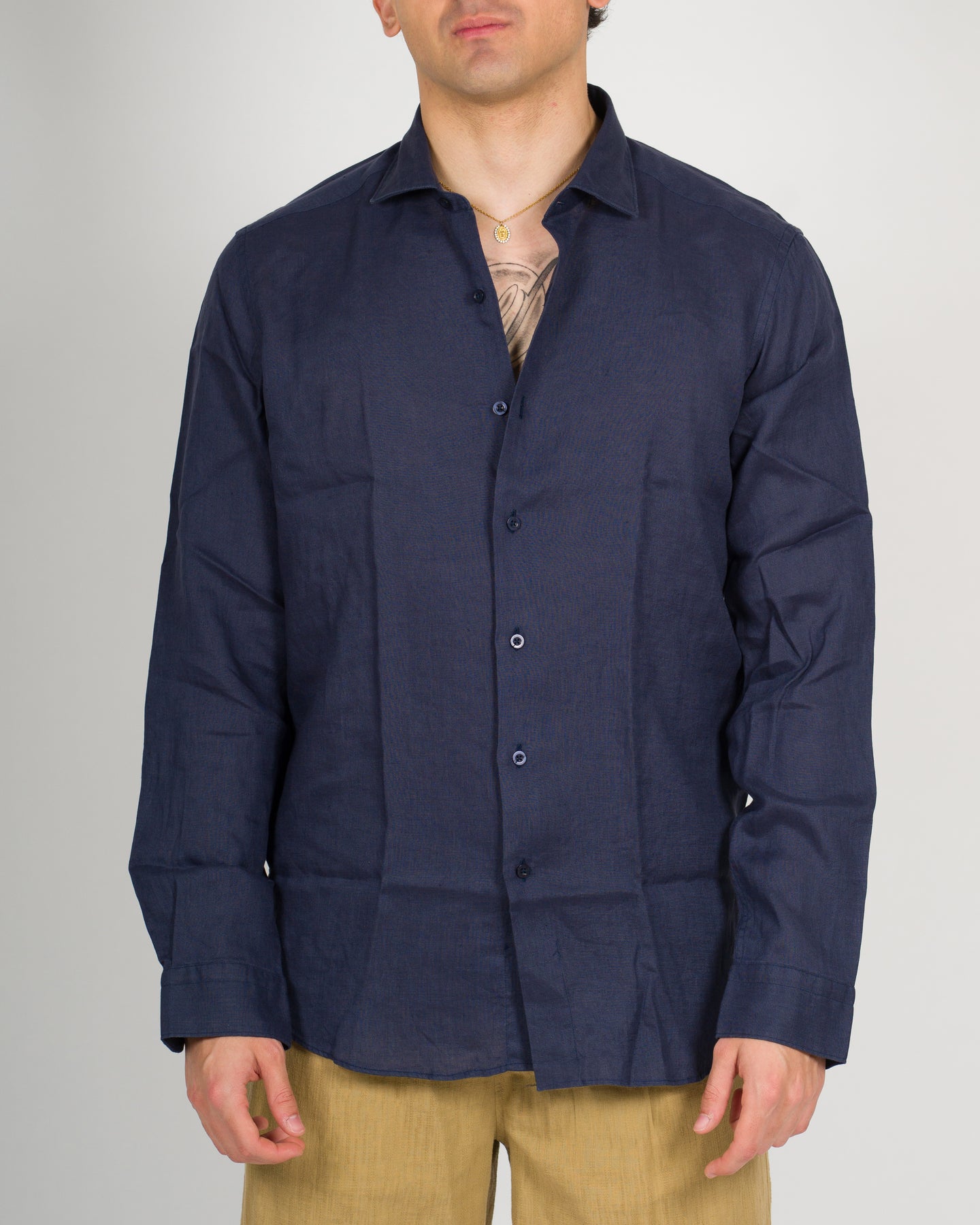 Camicia manica lunga collo francese in tessuto 100% lino graffiato.Il modello indossa la taglia L.