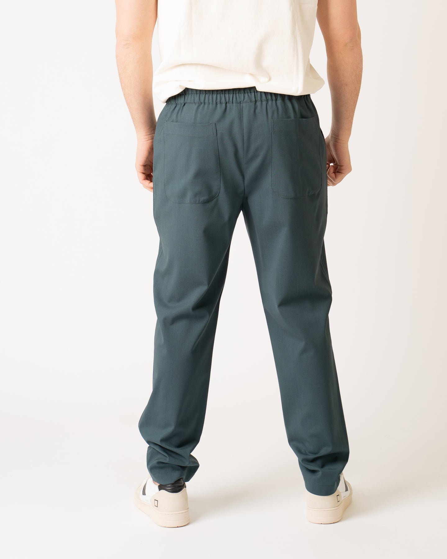 Trousers with elastic in cool teal color wool fabric.