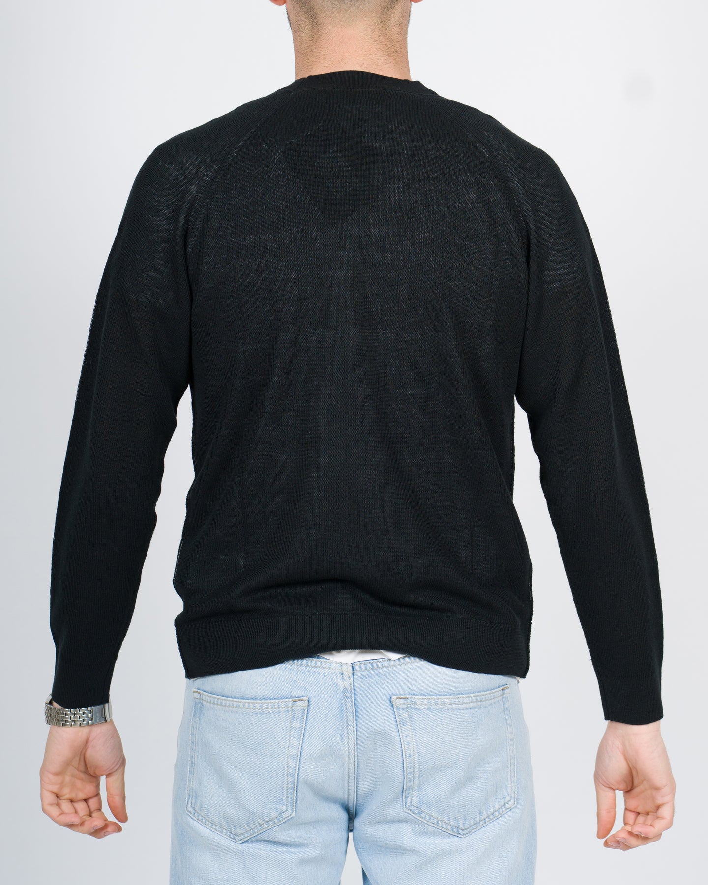 Maglia cardigan manica lunga con chiusura bottoni e profilo in contrasto al fondo panna.Il modello indossa la taglia L.
