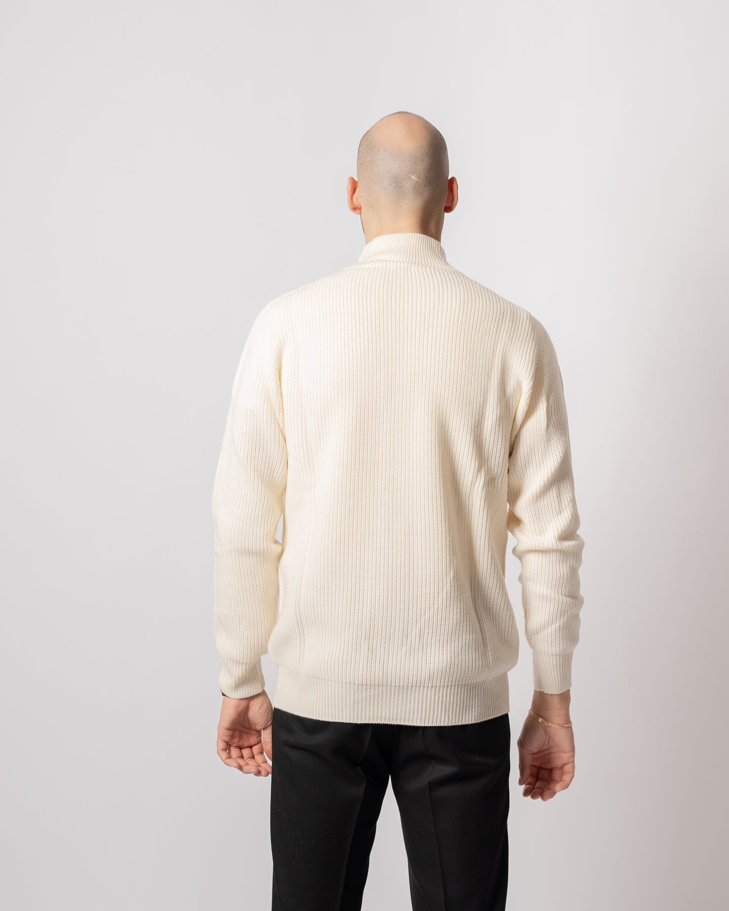 Maglia manica lunga in tessuto lana merinos con lavorazione a coste e chiusura full zip.