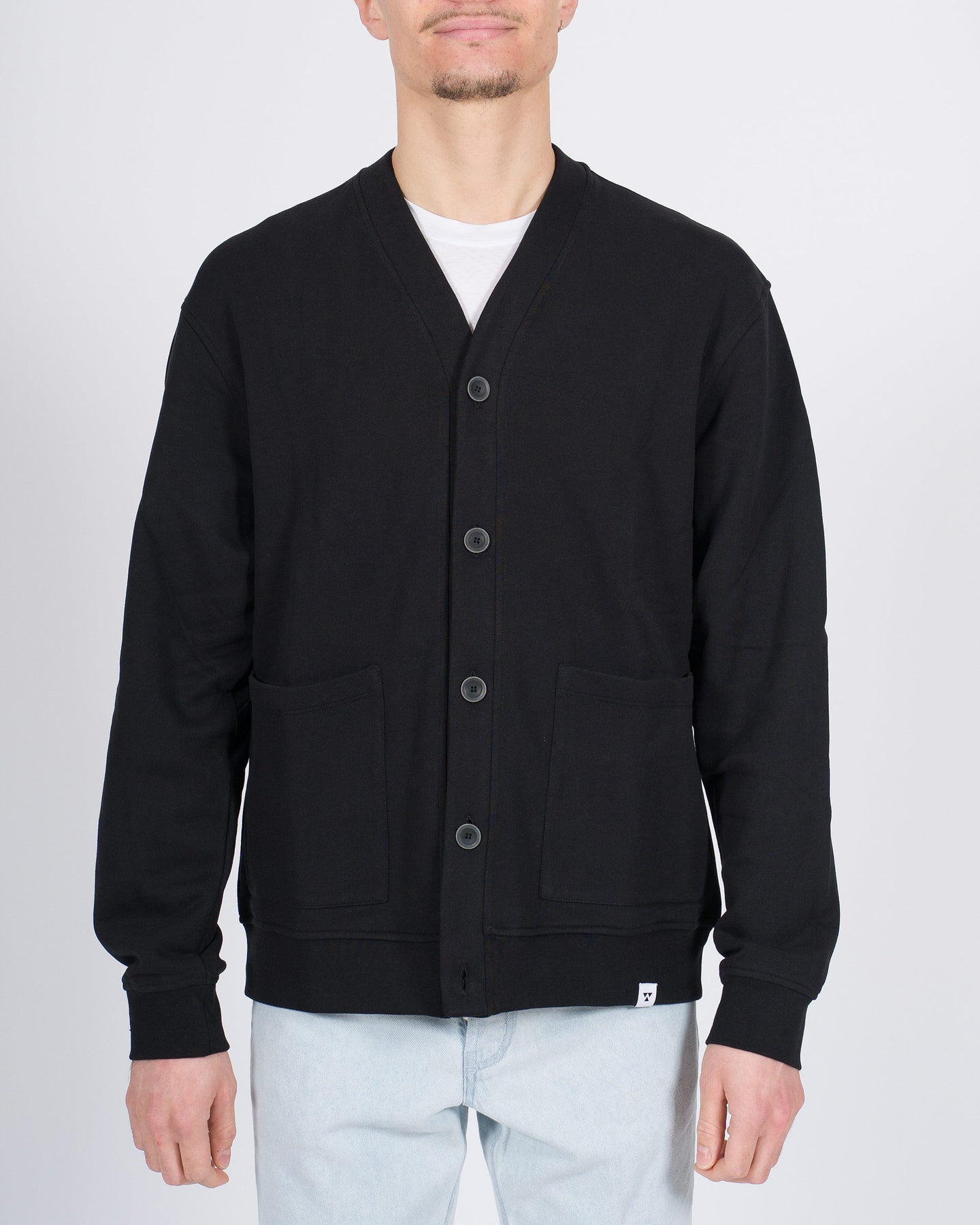 Cardigan in felpa a manica lunga con chiusura a bottoni e tasche anteriori, ideale per un look casual e versatile. Il colore nero dona eleganza e facilità di abbinamento in ogni stagione.Morbido e confortevole, completa l'outfit quotidiano con uno stile essenziale, pratico e sempre attuale.