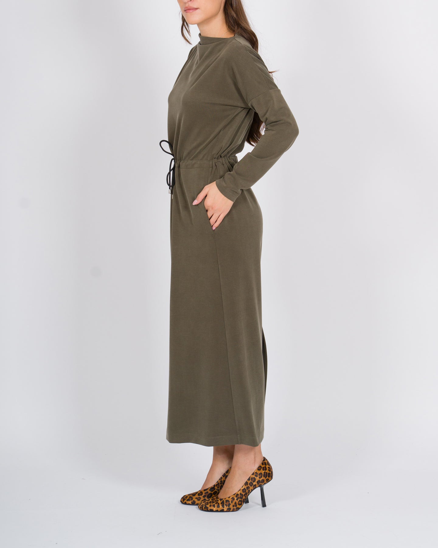 Comodo e sofisticato, questo abito lungo valorizza la silhouette grazie all'elastico in vita e alla coulisse, che permettono di adattarne la vestibilità con eleganza. Il collo asimmetrico basso dona un tocco moderno e femminile, mentre le maniche lunghe completano il design con sobrietà e raffinatezza.Perfetto per look comodi ed eleganti, si adatta a occasioni formali o momenti in cui comfort e stile si incontrano senza compromessi.