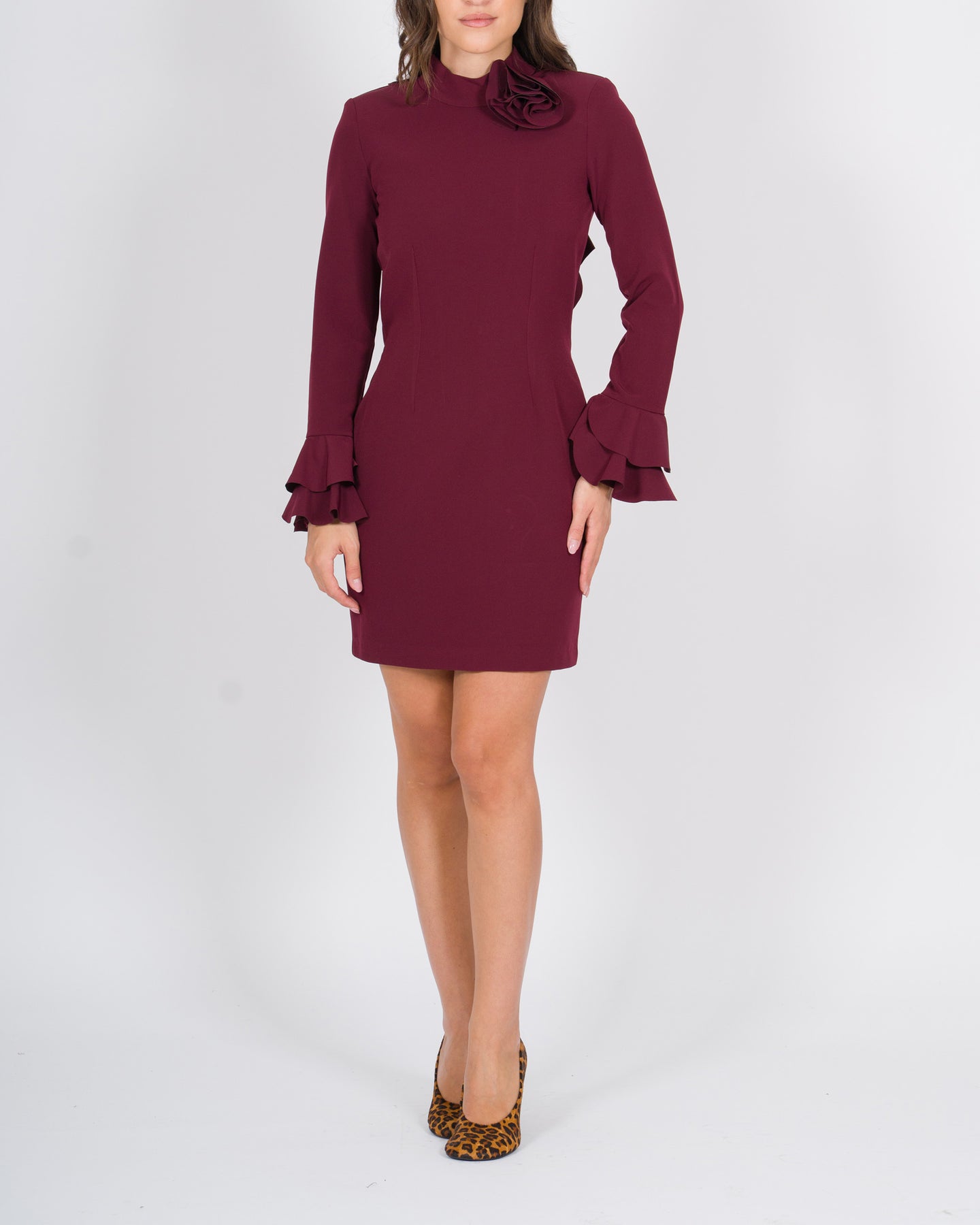 Femminile e sofisticato, questo mini abito si distingue per i volant sulle maniche e sul retro, che aggiungono movimento e leggerezza al capo. Presenta un'apertura posteriore per una vestibilità comoda e uno scollatura impreziosita da un fiore decorativo, che dona un tocco romantico e distintivo. Le spalline imbottite completano il design, valorizzando la silhouette con eleganza.Perfetto per look formali eleganti, è ideale per occasioni speciali in cui desideri un outfit di grande impatto e raffinatezza.
