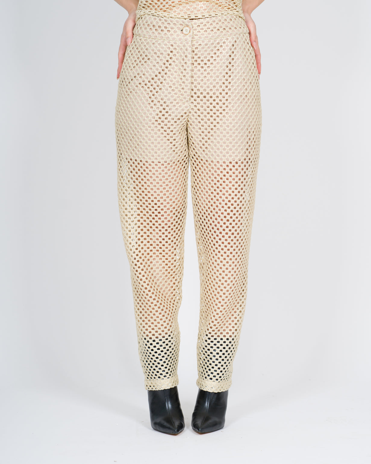 Pantalone modello baggy in tessuto traforato con sotto pantalone.