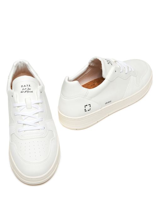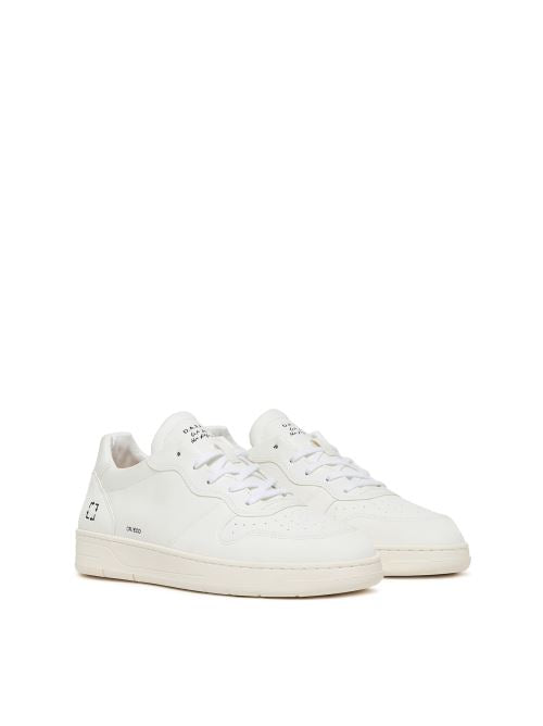 Sneaker bassa in pelle derivata da mais colore bianco.La punta è traforata per una maggiore traspirazione.Sulla linguetta è impressa la scritta D.A.T.E..I lacci sono in cotone riciclato e il logo quadrato recycled ed il codice sono impressi lateralmente.Talloncino posteriore in pelle vegana colore bianco.Fodera in pelle derivata da mais.Il soletto interno in pu riciclato e sughero è rialzato di 2.5 cm per un migliore comfort.
