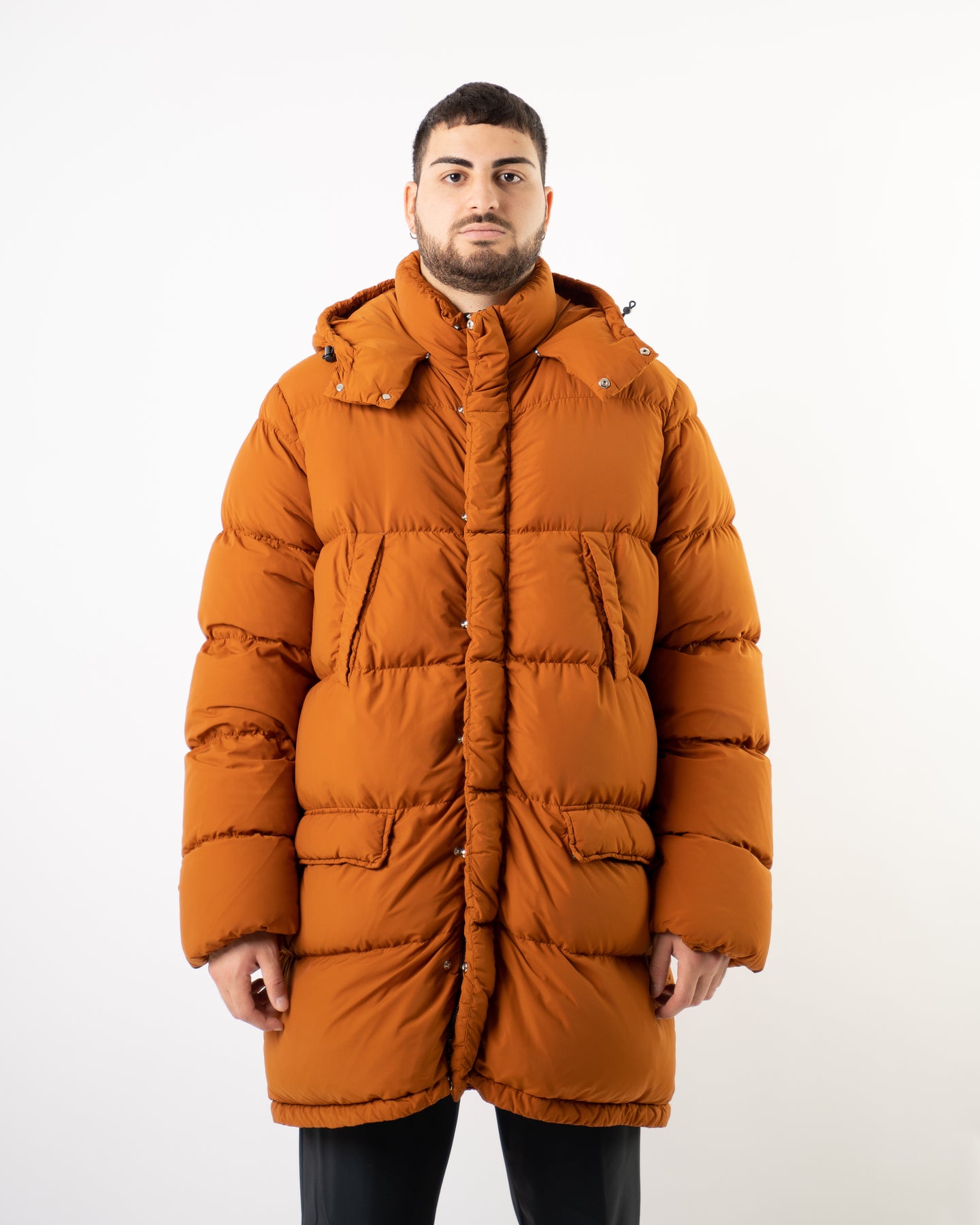 Giubbotto trapuntato lungo colore ruggine con imbottitura piuma d'oca.