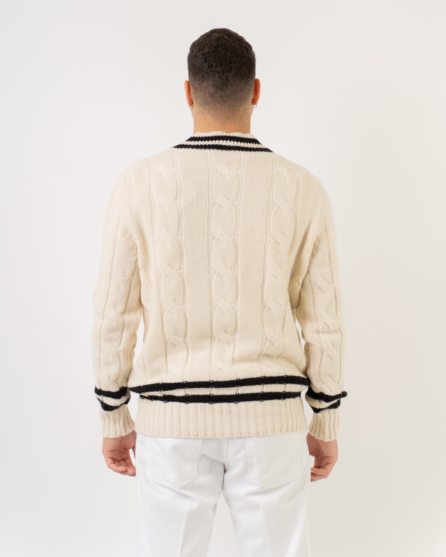 Maglia scollo a V profondo, in tessuto misto cashmere colore panna, con lavorazione a trecce e profili neri.
