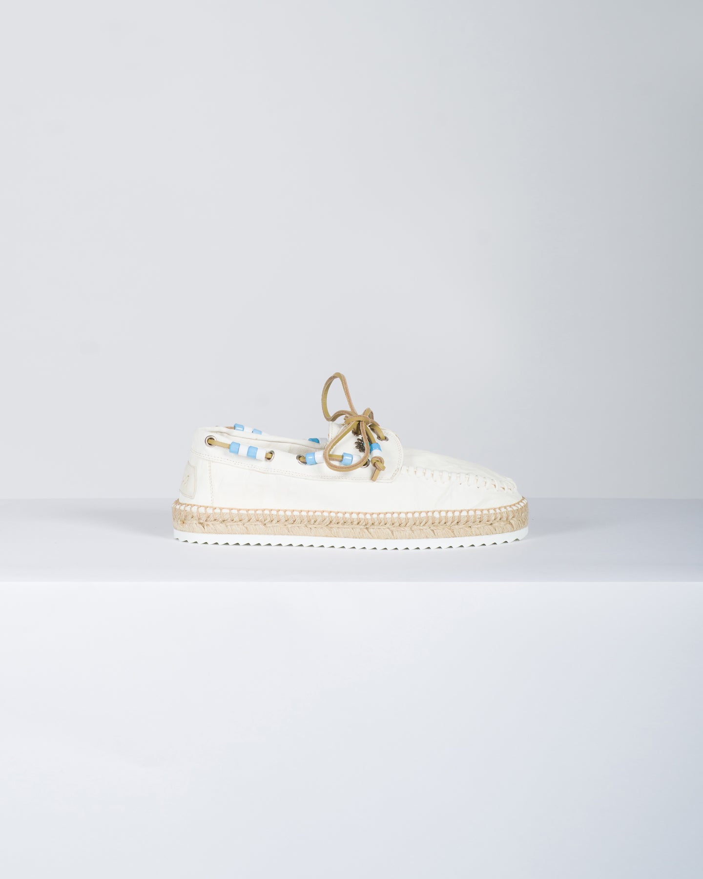 Topsiders in pelle lavata bianca, con lacci in pelle più perline, intersuola in corda con battistrada leggero micro bianco