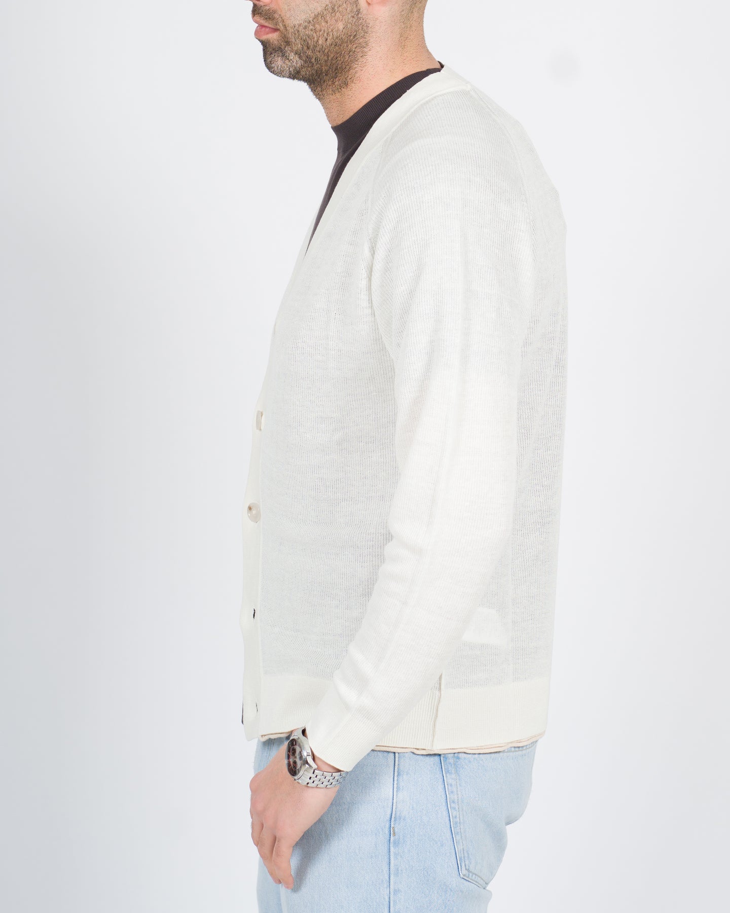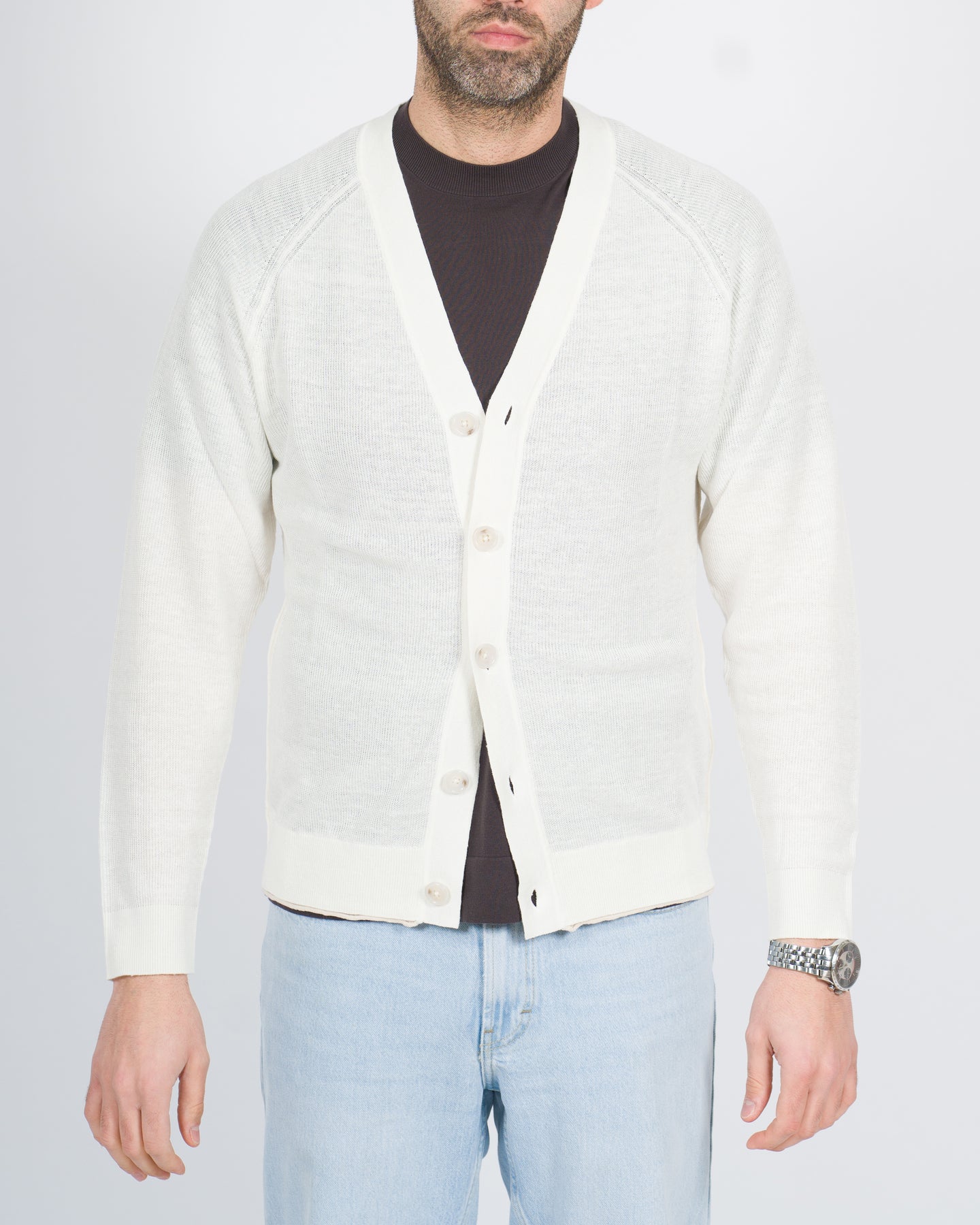 Maglia cardigan manica lunga con chiusura bottoni e profilo in contrasto al fondo panna.Il modello indossa la taglia L.