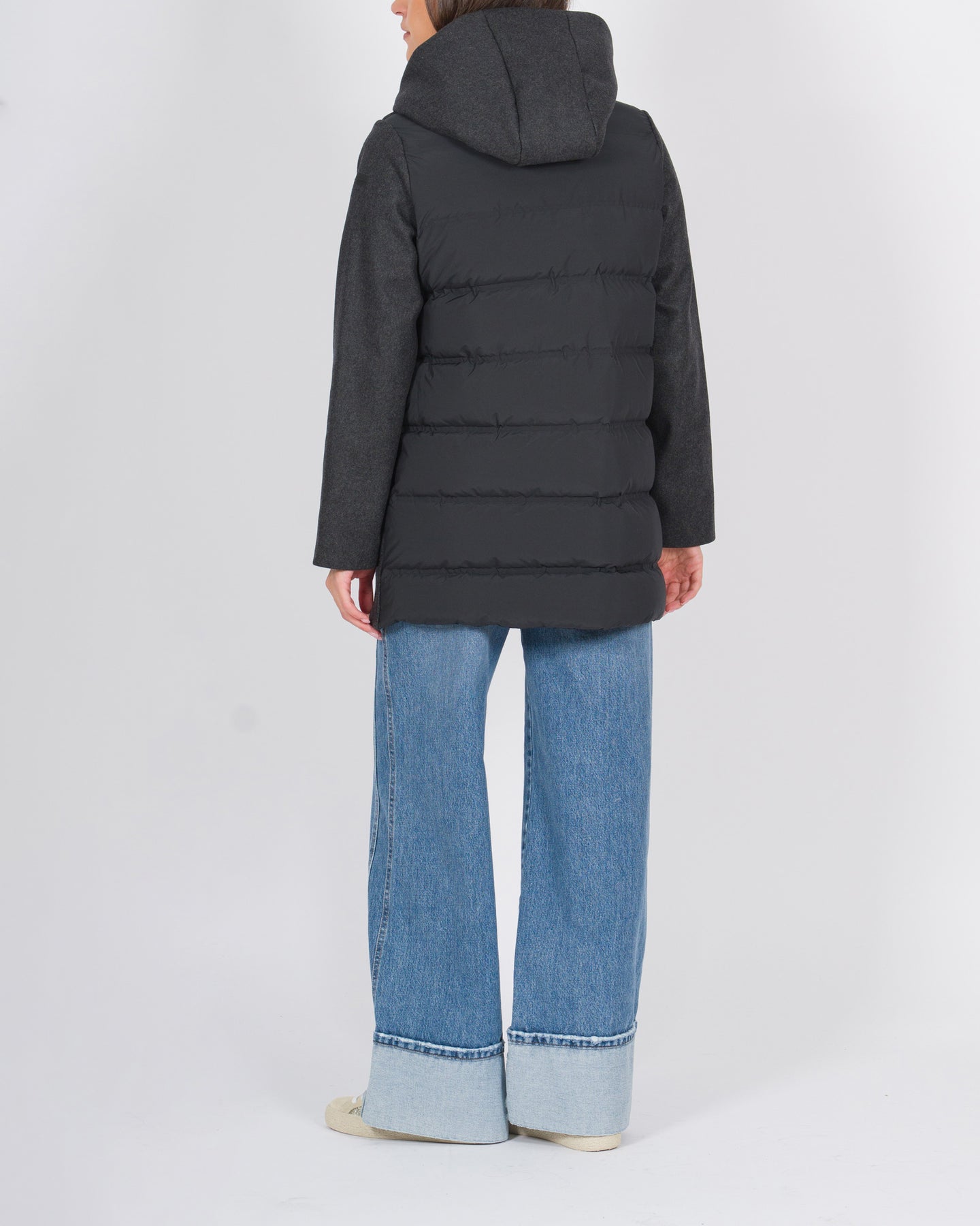 Il capospalla di grande personalità è ideale per la donna che desidera un look raffinato e ricercato sia nella linea, sia nella ricerca dei tessuti. Realizzato in pregiato misto cashmere nella parte frontale, presenta sul retro la texture ininterrotta della morbida imbottitura in piuma d'anatra contenuta nei canali tubici, totalmente privi di impunture. I due diversi tessuti sono accoppiati nel cappuccio ampio e avvolgente, nel creare un gioco di texture di grande effetto visivo. La silhouette del parka è valorizzata dalle tasche verticali con zip termonastrate, sovrastate dalle tasche dal taglio diagonale e chiuse dalla patella. La patta che nasconde la chiusura centrale a zip termonastrata è impreziosita dai bottoni a barretta, che conferiscono un ulteriore tocco di stile al design essenziale. La lunghezza del capo appena sotto i fianchi consente infiniti abbinamenti con i capi della collezione, in particolare con una maglia a collo alto con stampa retrò e un paio di pantaloni a palazzo con texture millerighe dai toni cangianti.