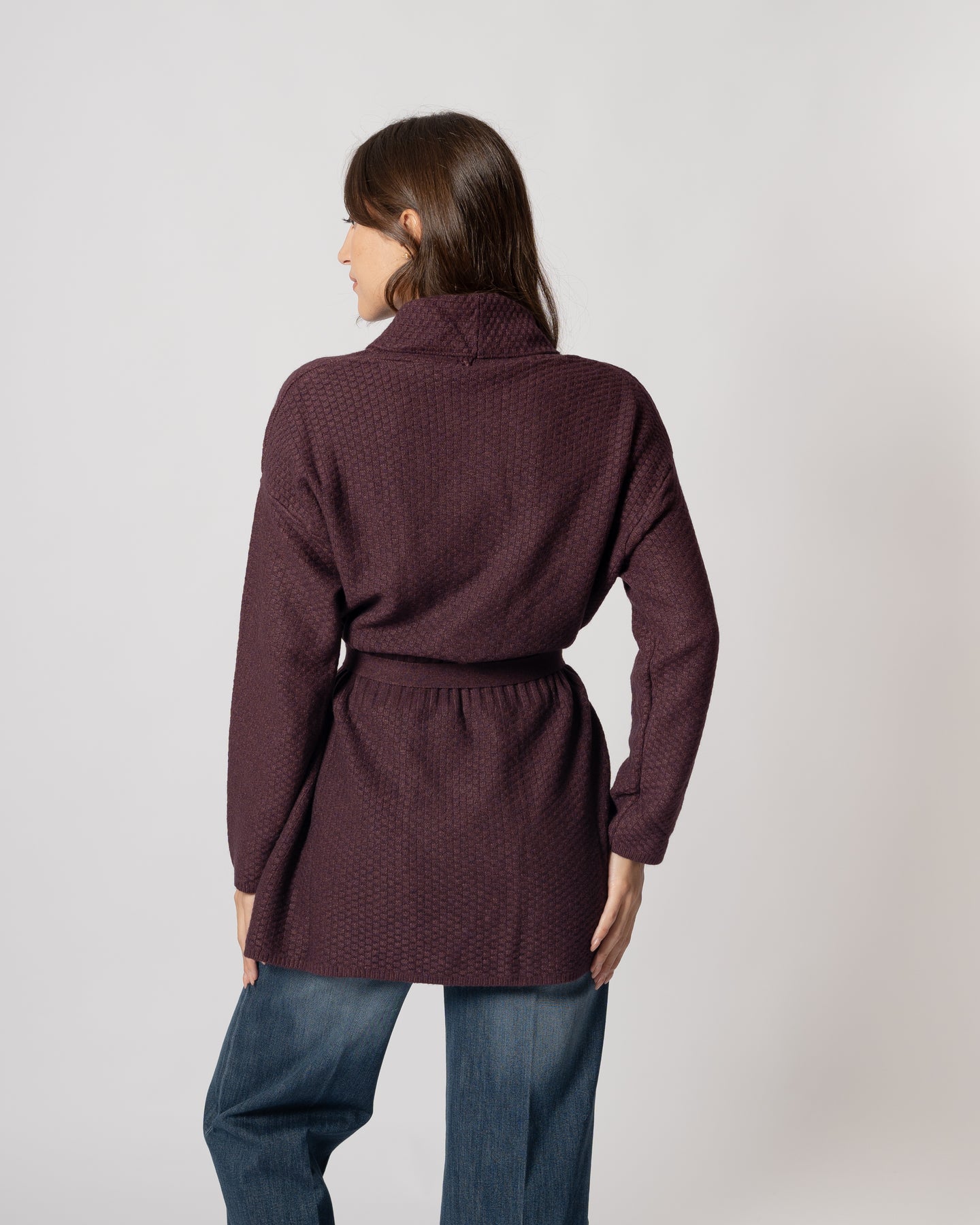 Cardigan in maglia tessuto lana e viscosa con collo sciallato e cintura.