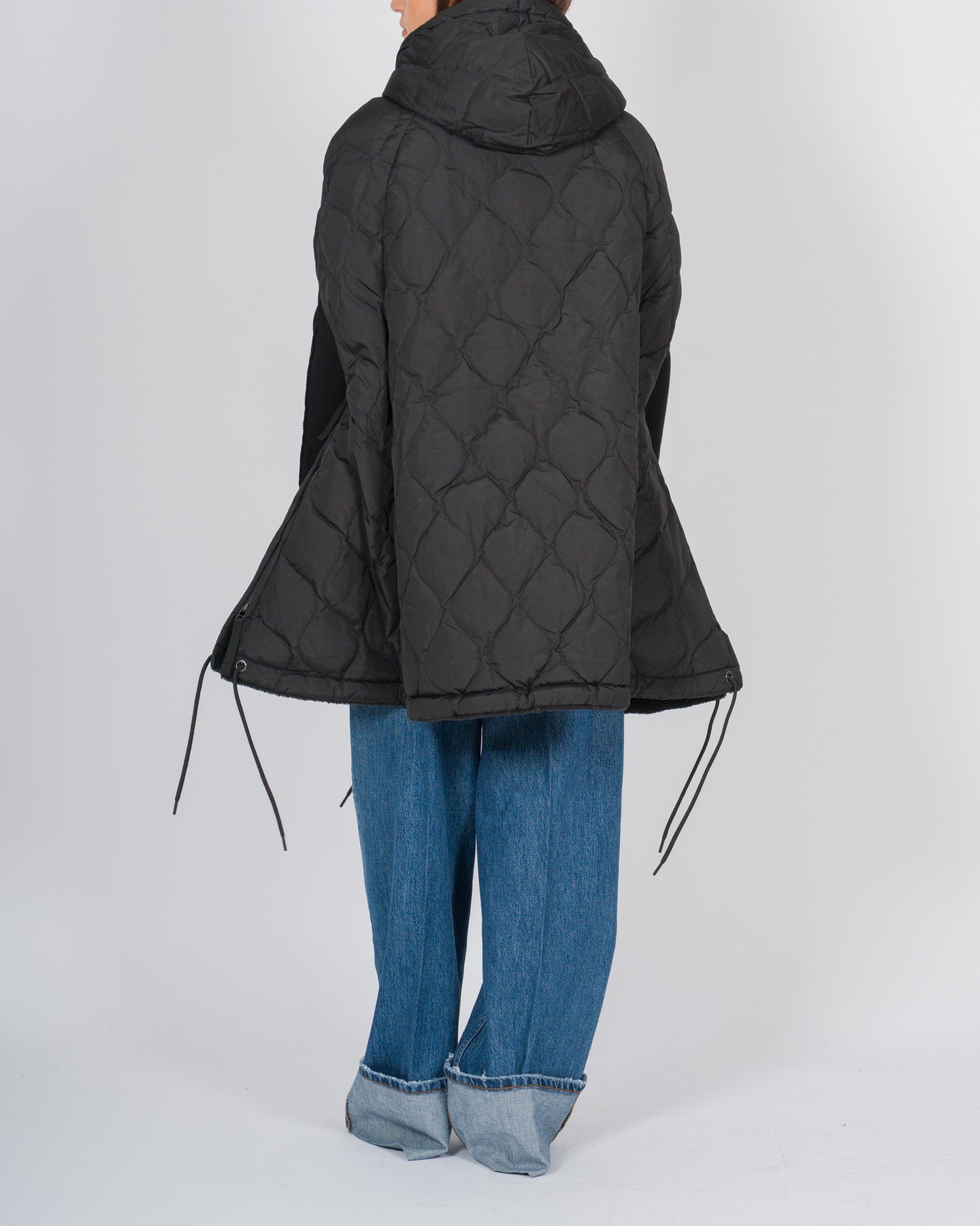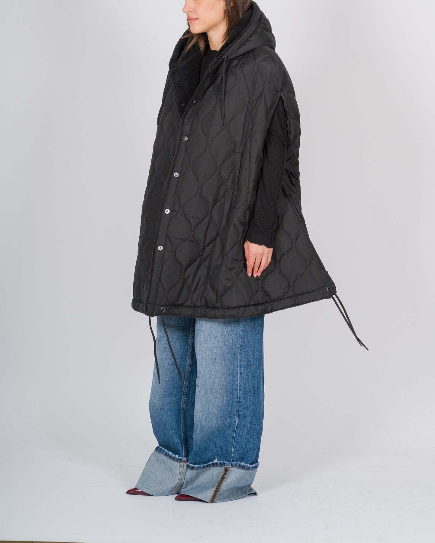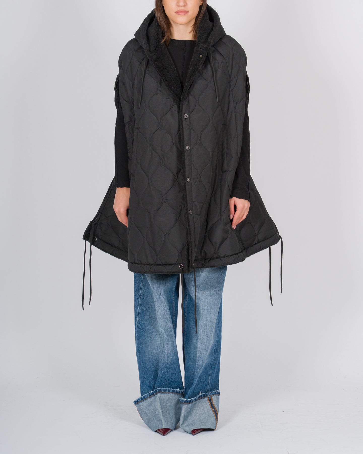 La mantella trapuntata reversibile firmata Taion combina funzionalità, comfort e stile contemporaneo.Realizzata con tecnologia high-tech Taion, il capo offre un design senza maniche, ideale per stratificazioni leggere e versatili durante la stagione fredda.Il lato esterno presenta un tessuto tecnico trapuntato, mentre l'interno è foderato in morbido orsetto nero, per una sensazione calda e avvolgente a contatto con la pelle.Il cappuccio con stringhe regolabili permette di adattare la vestibilità alle esigenze climatiche, mentre il taglio ampio e il design a mantella garantiscono libertà di movimento e un look contemporaneo e urbano.La reversibilità consente di cambiare facilmente l'estetica del capo: un lato tecnico e minimal, l'altro soffice e cozy, perfetto per affrontare i mesi più freddi con stile.Un capo Made in Corea, sinonimo di qualità, innovazione.