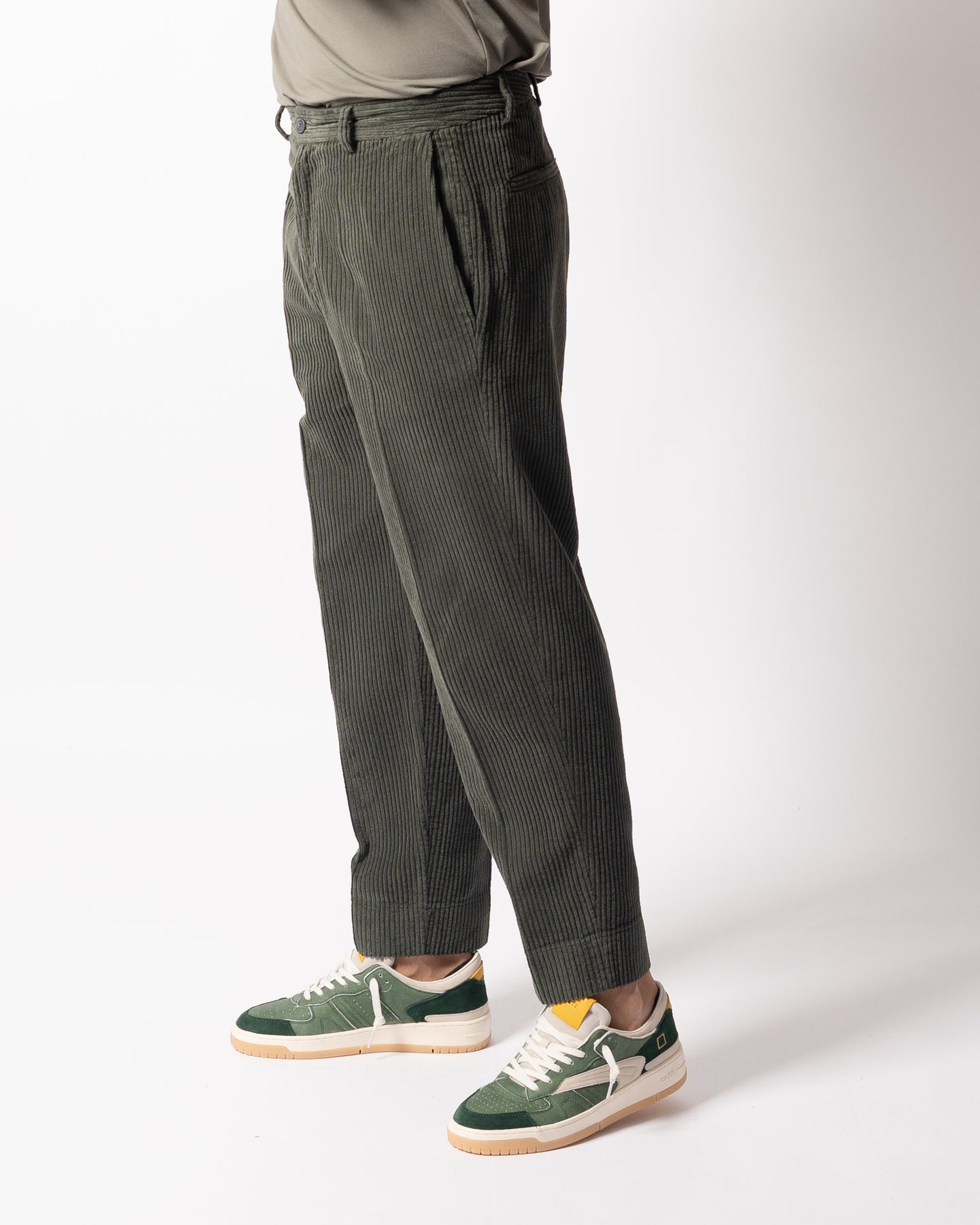 Il modello chiba è un pantalone in tessuto velluto rocciatore dai volumi ampi, vita alta e tasche a filo.