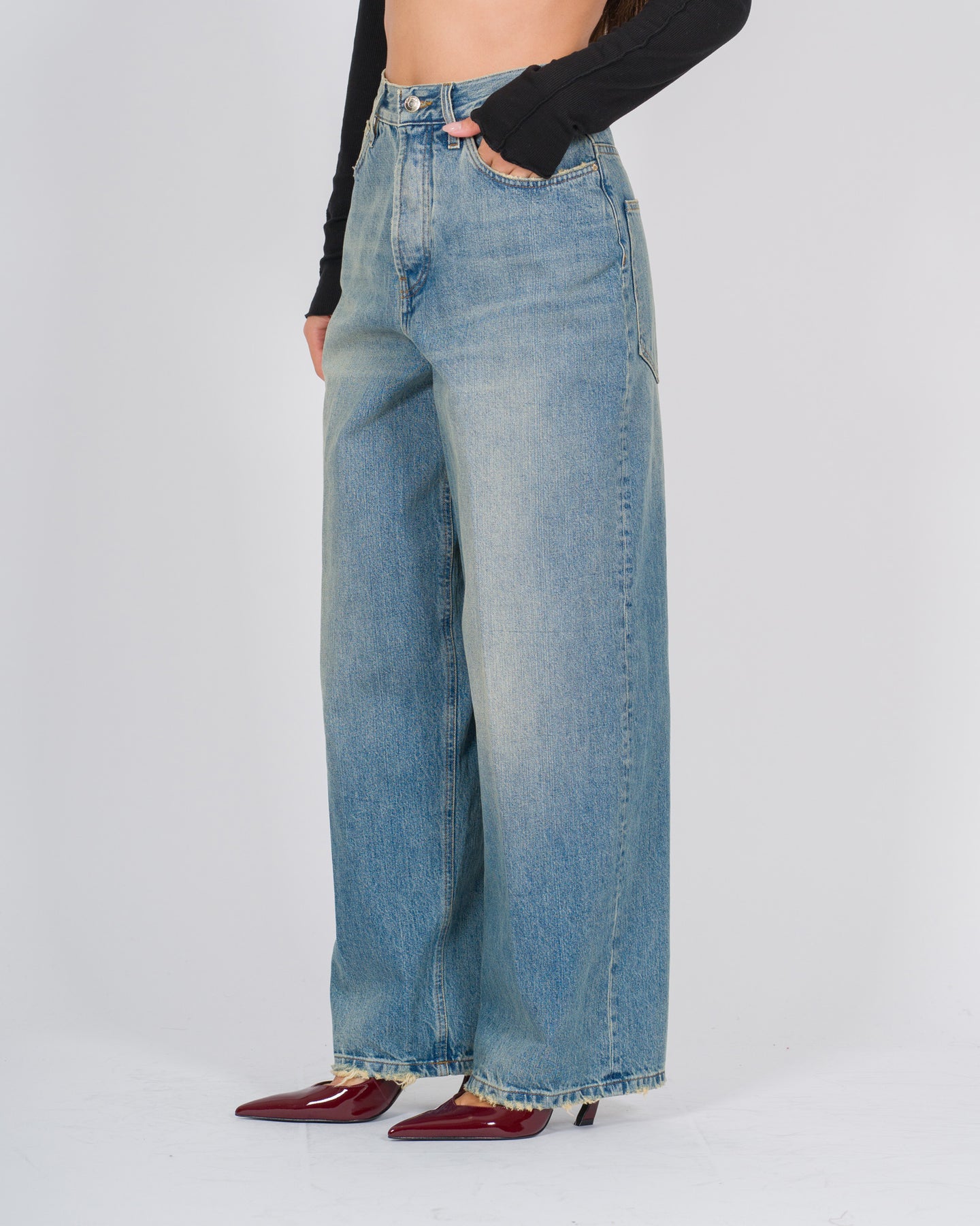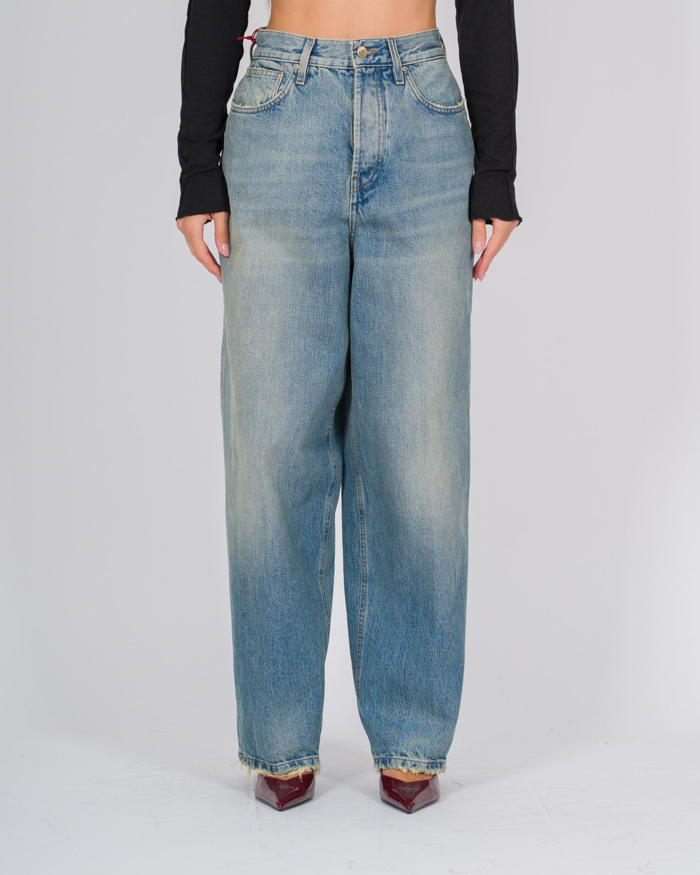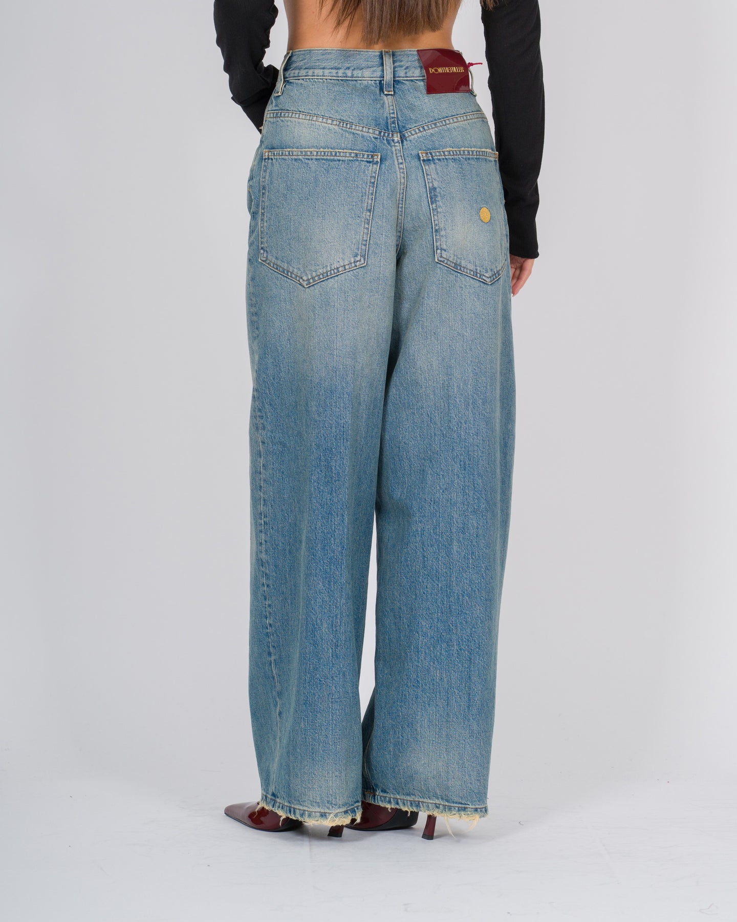 Il modello Berlino incarna la ricerca e la tradizione denim di Don The Fuller, marchio italiano riconosciuto per la sua attenzione maniacale ai dettagli e ai trattamenti del tessuto.Realizzato in denim di cotone premium, questo jeans è sottoposto a un lavaggio sabbiato artigianale che ne esalta la grana e regala una tonalità blu naturale, con sfumature leggere e autentiche.Il risultato è un capo dal carattere deciso, con un effetto vissuto e tridimensionale, senza rinunciare alla pulizia delle linee.La costruzione è a cinque tasche, con vita alta e volumi ampi che richiamano le silhouette workwear reinterpretate in chiave contemporanea.Le cuciture tono su tono e le impunture rinforzate sottolineano la qualità manifatturiera, mentre la salpa in pelle bordeaux a contrasto sul retro firma il capo con discrezione e riconoscibilità.Il fondo sfrangiato a taglio vivo aggiunge un tocco spontaneo e moderno, tipico dei lavaggi manuali più ricercati.Ogni jeans Don The Fuller è realizzato interamente in Italia, attraverso una filiera corta e sostenibile, dove ogni fase -- dal taglio al lavaggio -- è eseguita con cura sartoriale.Il risultato è un denim autentico, materico e confortevole, pensato per durare nel tempo e raccontare la propria storia a ogni utilizzo.