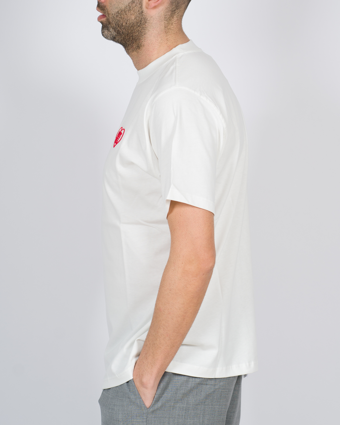 T-shirt mezza manica tessuto cotone con logo cuore rosso.Il modello indossa la taglia L.