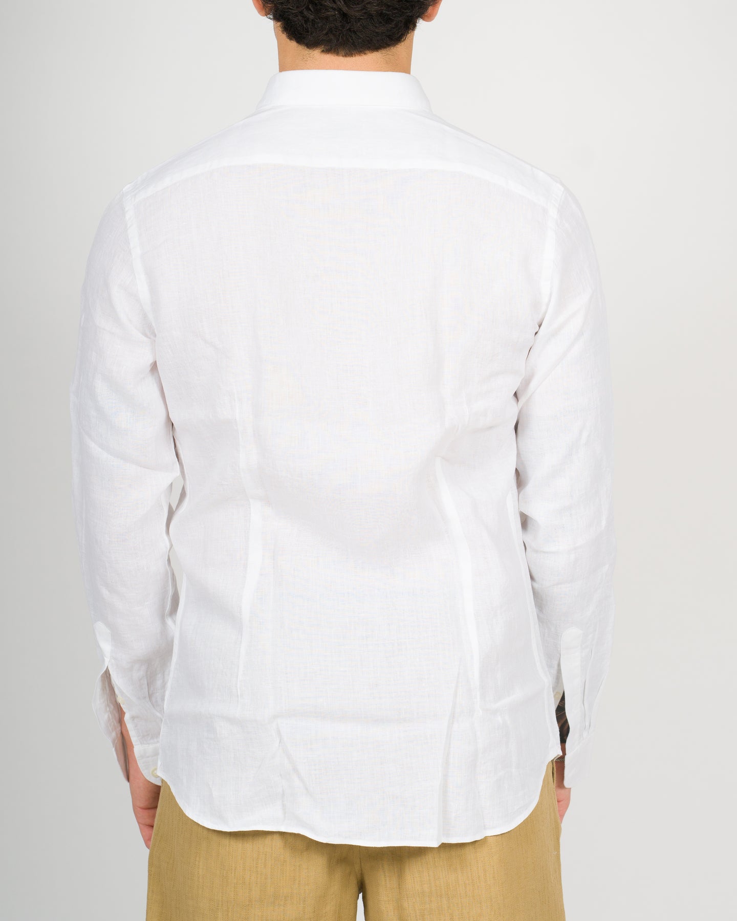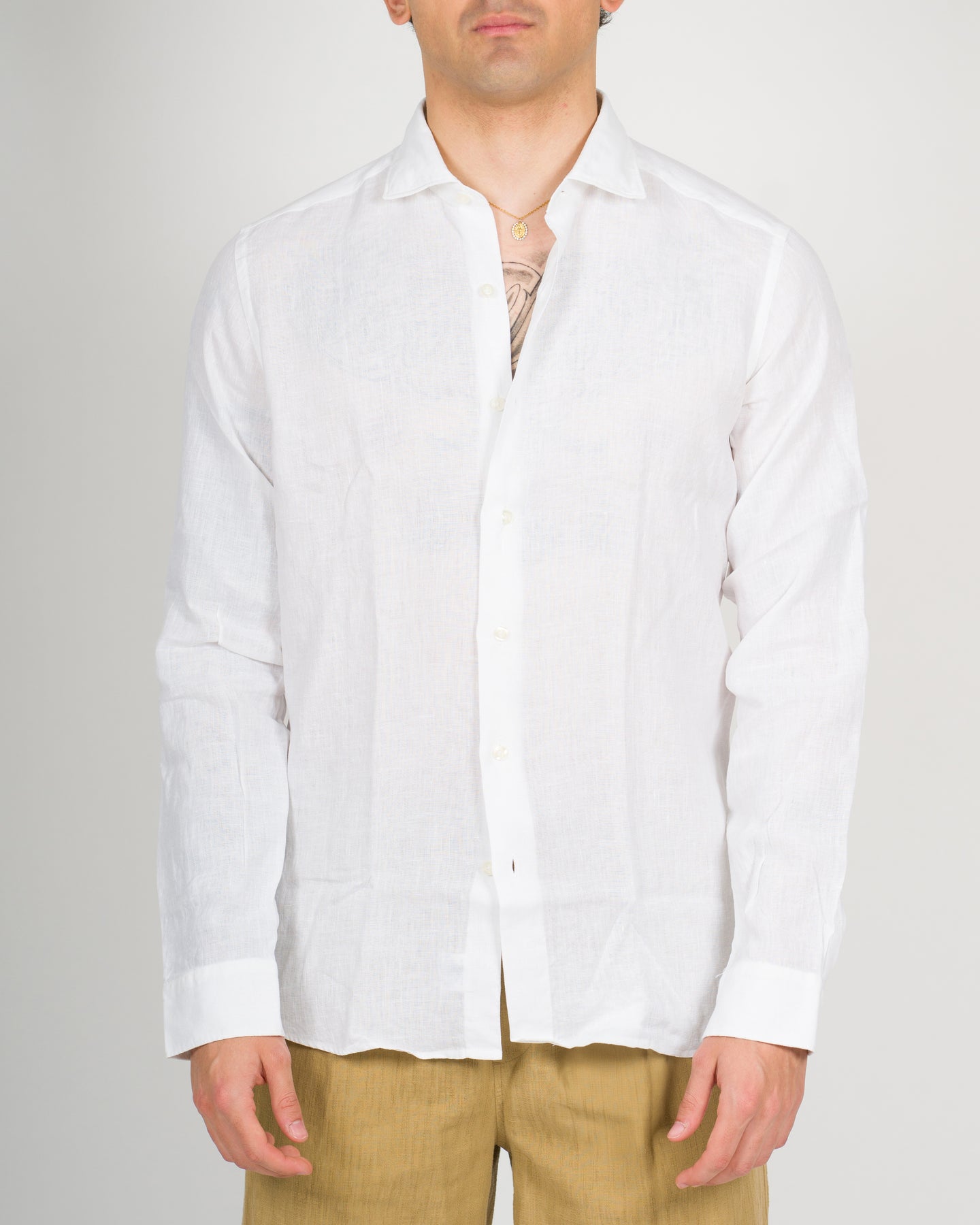Camicia manica lunga collo francese in tessuto lino graffiato, vestibilità regular.Il modello indossa la taglia L.
