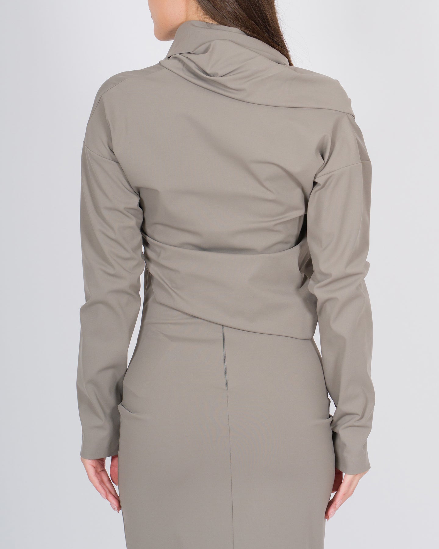 Un capo dal fascino sofisticato e femminile, questa blusa manica lunga in seta firmata Meimej unisce eleganza classica e dettagli contemporanei. Il collo sciallato e i drappeggi morbidi lungo il busto creano un effetto fluido e armonioso, valorizzando la silhouette con delicatezza.Realizzata in lana di alta qualità colore tortora, la blusa si presta ad abbinamenti eleganti o minimalisti, perfetta sia per look da ufficio raffinati sia per outfit da sera discreti e sofisticati. La leggerezza del tessuto assicura comfort e un movimento naturale ad ogni passo.