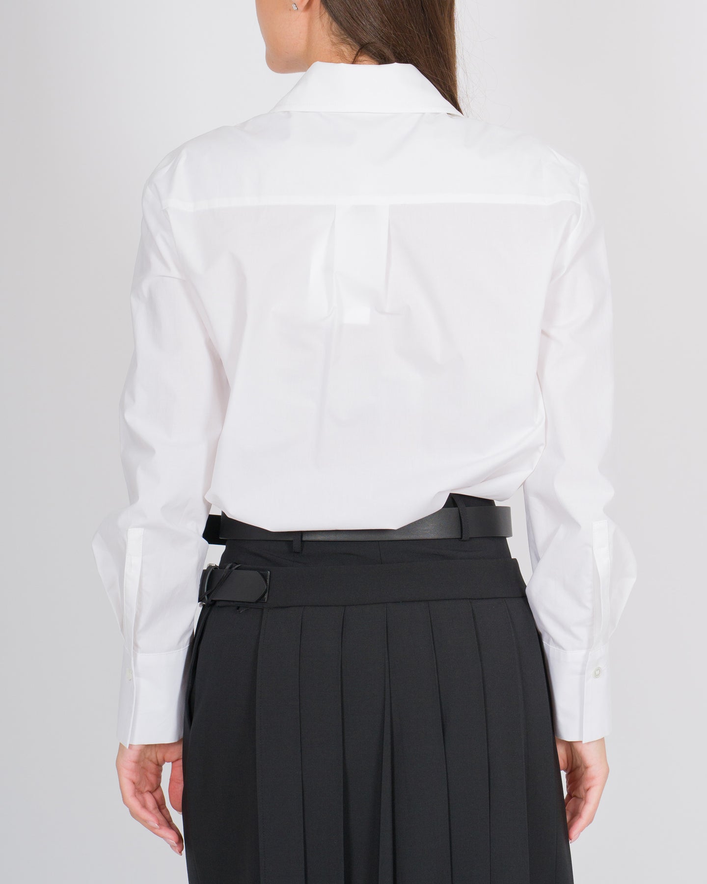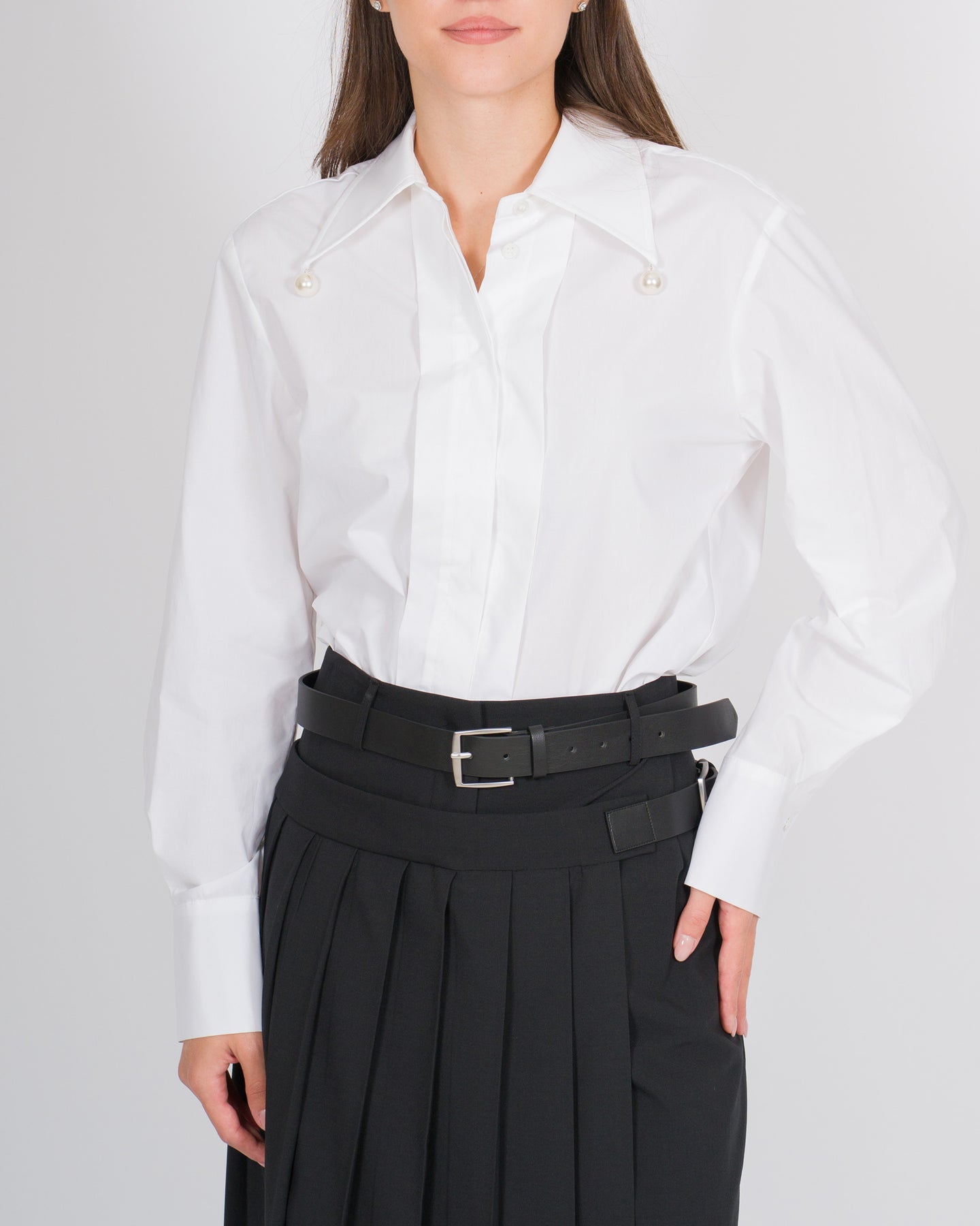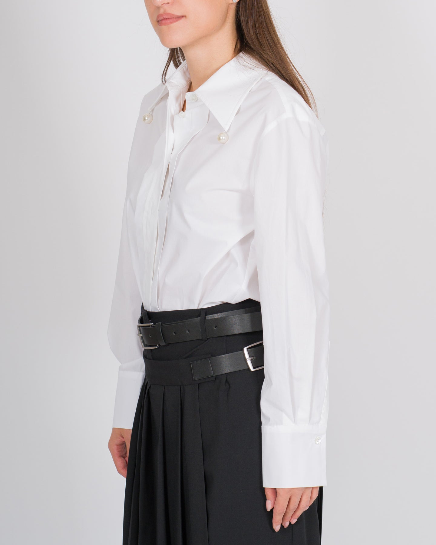 Un capo classico reinterpretato con dettagli preziosi, questa camicia manica lunga in cotone popeline bianco firmata Meimej unisce eleganza sartoriale e femminilità contemporanea. La linea pulita e minimal è arricchita dalle applicazioni di perle sul davanti, che creano un delicato effetto luminoso e raffinato.Realizzata in cotone popeline morbido e compatto, garantisce vestibilità confortevole e silhouette definita, rendendo la camicia perfetta sia per look professionali che per outfit ricercati da giorno o da sera.