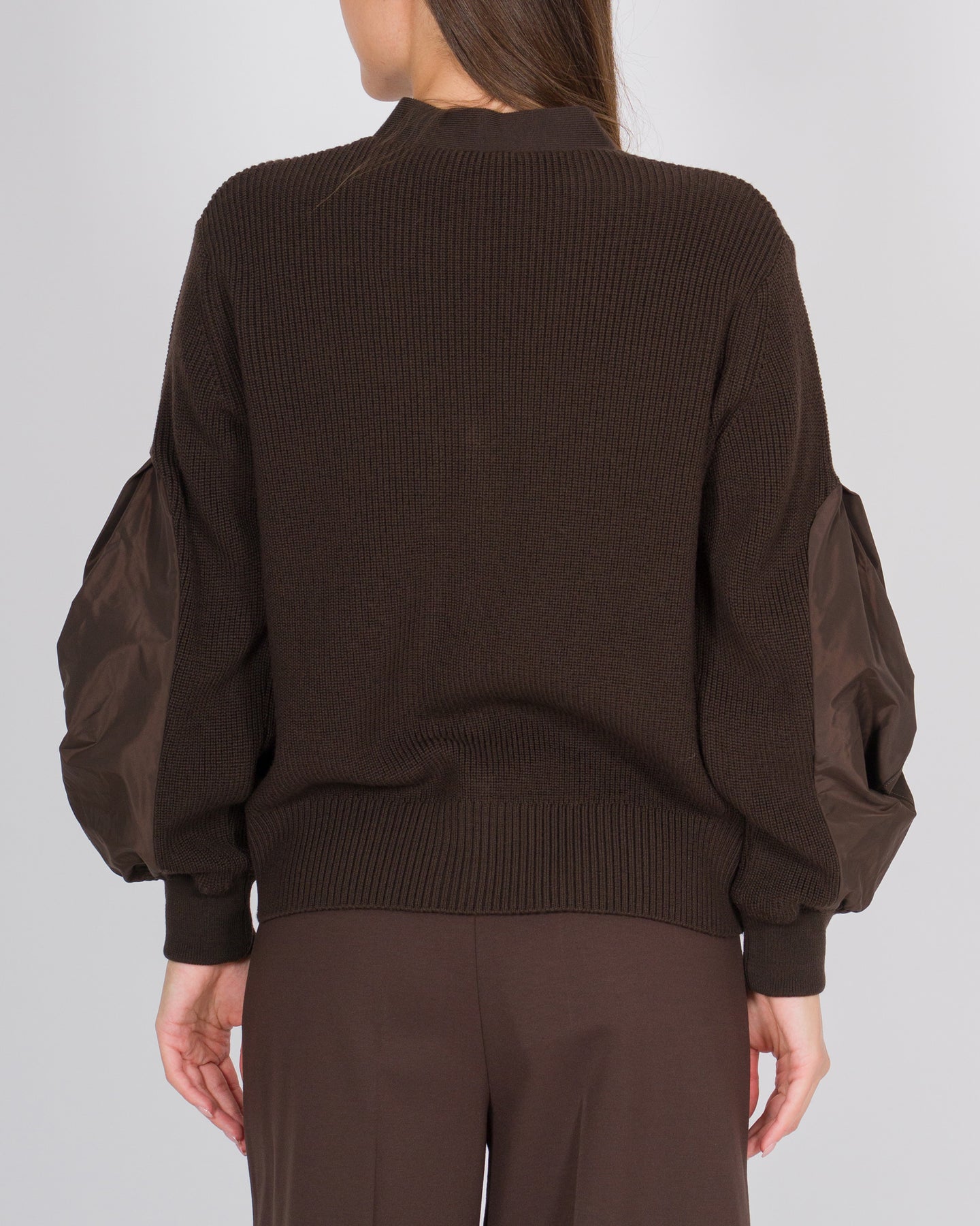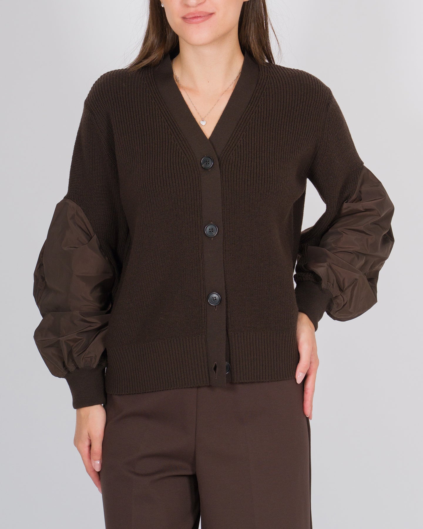 Un capo dal fascino contemporaneo, questo cardigan in maglia a costine colore marrone firmato Meimej combina tradizione sartoriale e dettagli innovativi. La chiusura frontale con bottoni valorizza la silhouette, mentre le maniche lavorate in tessuto tecnico introducono un contrasto materico sofisticato e moderno.Realizzato in maglia morbida e strutturata, garantisce comfort e vestibilità perfetta, rendendolo ideale per layering raffinati o look casual chic dal carattere ricercato. Un capo versatile che unisce eleganza discreta e stile contemporaneo.