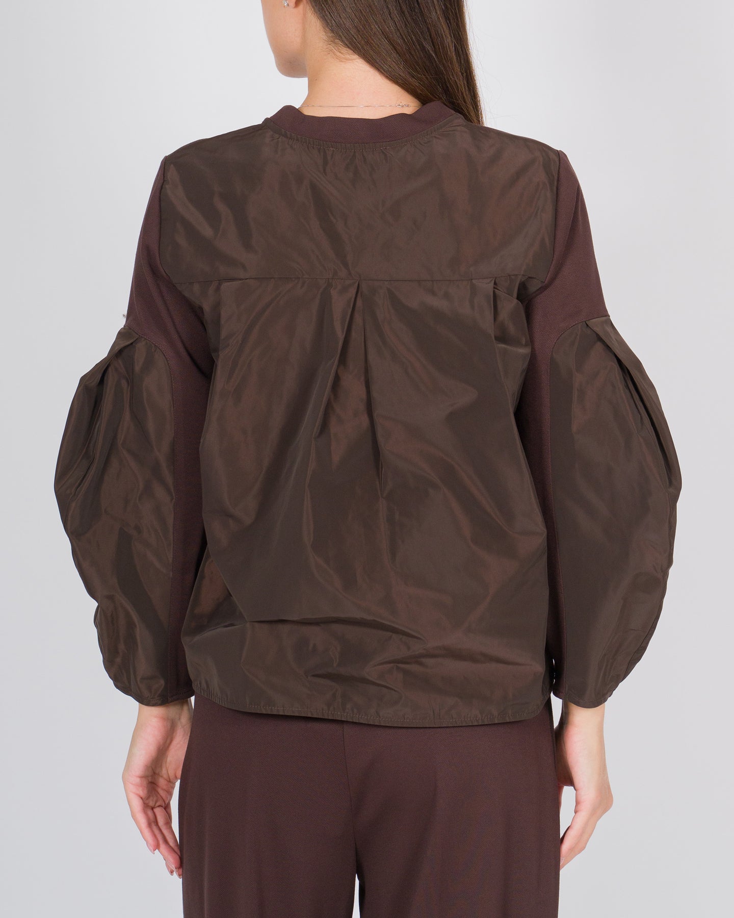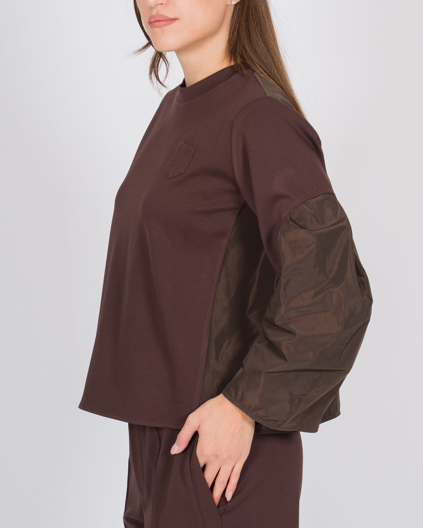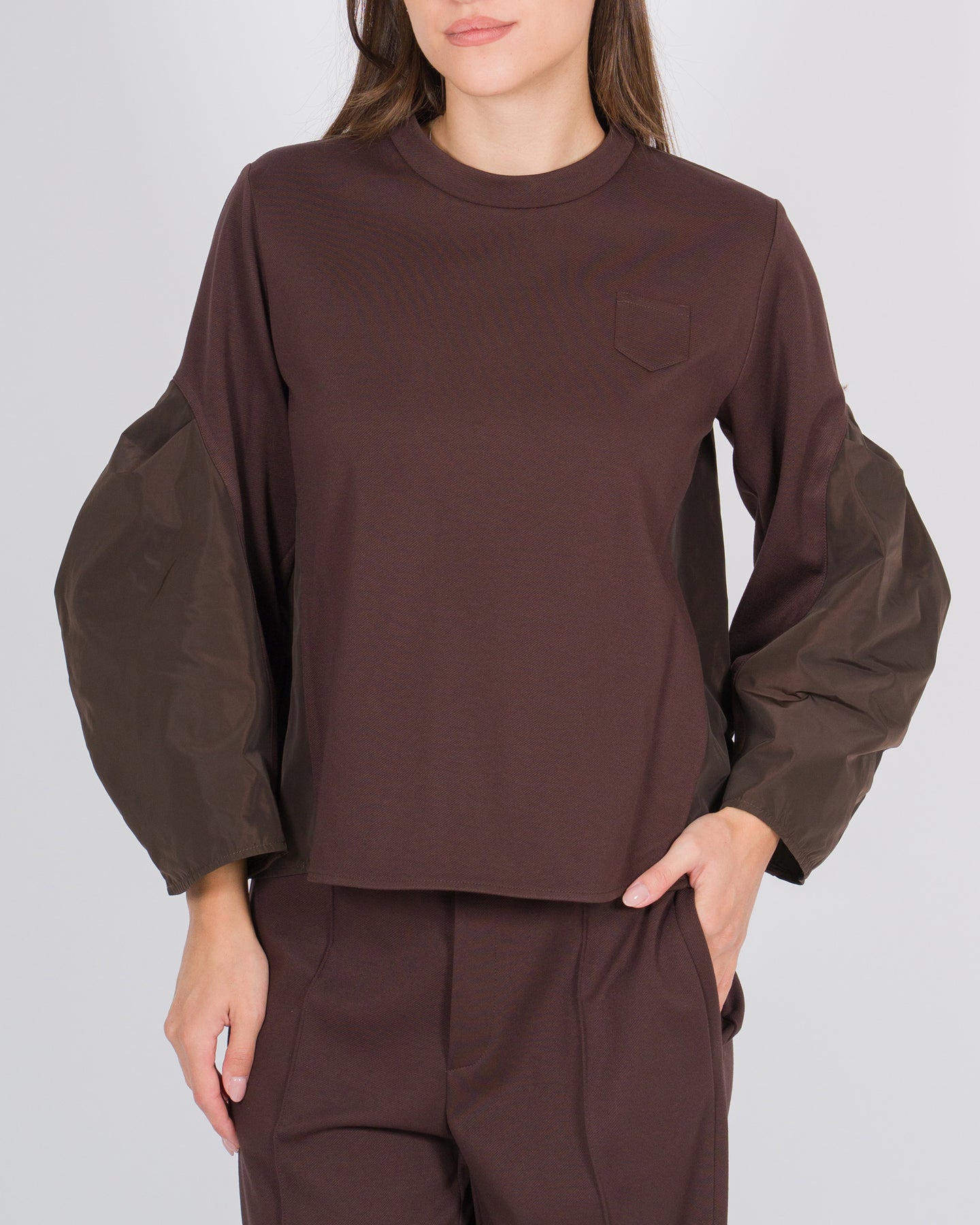 Un capo che unisce comfort e design contemporaneo, questa T-shirt manica lunga in lana a diagonale della linea Meimej è pensata per chi ama dettagli distintivi e materiali di qualità. Le maniche effetto palloncino e il dietro del capo sono realizzati con un match di tessuti tecnici, creando un elegante contrasto materico e aggiungendo dinamismo alla silhouette. Il taschino sul petto completa il design con un accento funzionale e raffinato.La lavorazione a diagonale valorizza il corpo e conferisce movimento, rendendo il capo versatile per look da giorno e layering sotto blazer o capispalla leggeri. Questa T-shirt riflette la filosofia Meimej: equilibrio armonioso tra innovazione, comfort e raffinatezza.