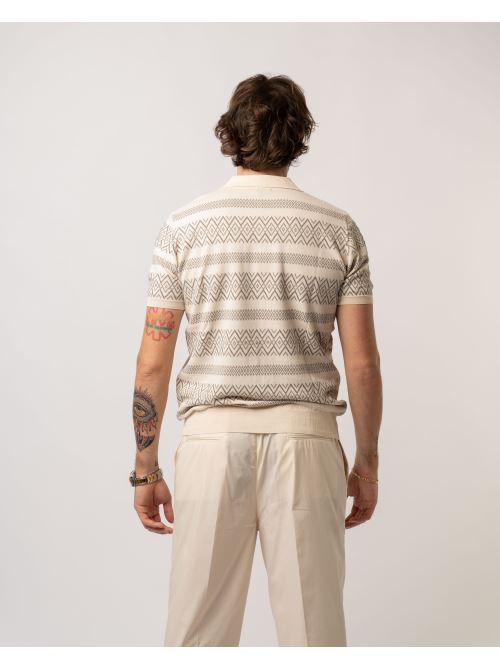 Polo cardigan mezza manica in tessuto cotone panna con lavorazione greca grigio.