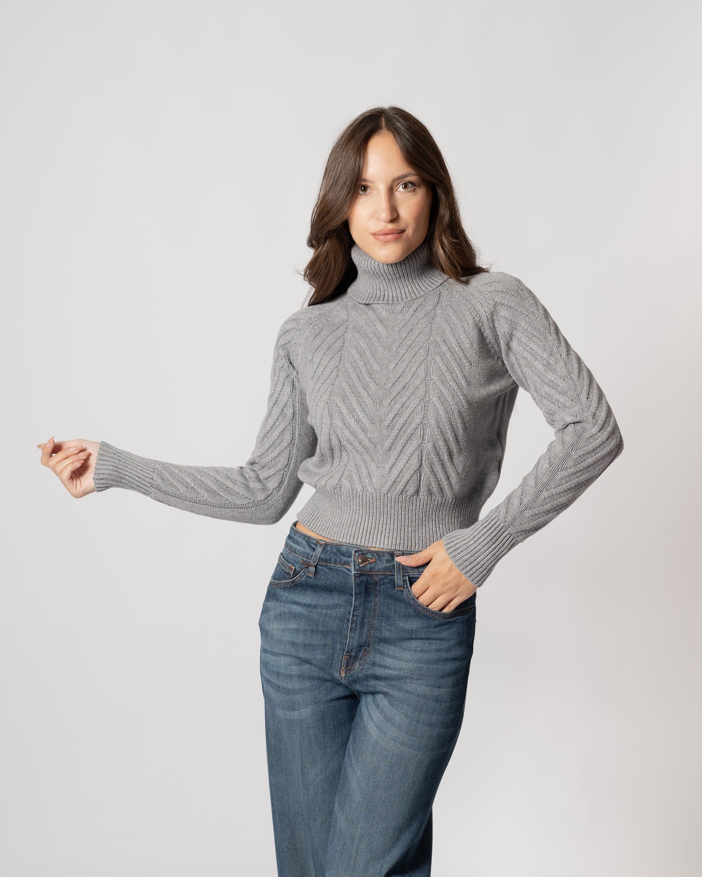 Maglia collo alto manica lunga in tessuto lana e viscosa con lavorazione spigata e lunghezza alla pancia.