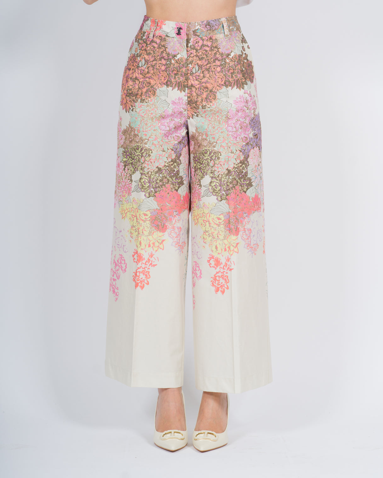 Pantaloni cropped firmati dall'artista Myfo per la collezione Actitude in cotone con stampa floreale piazzata. Hanno chiusura con zip e bottone logato in metallo, tasche alla francese, piega stirata e linea a palazzo.