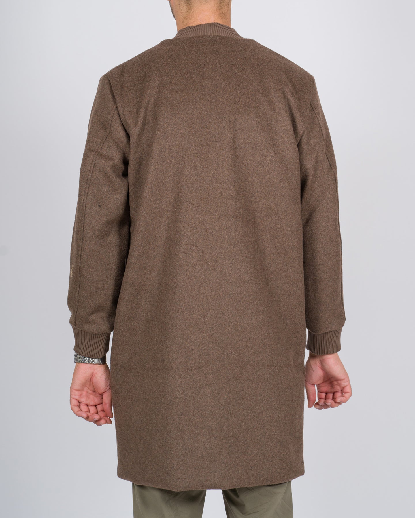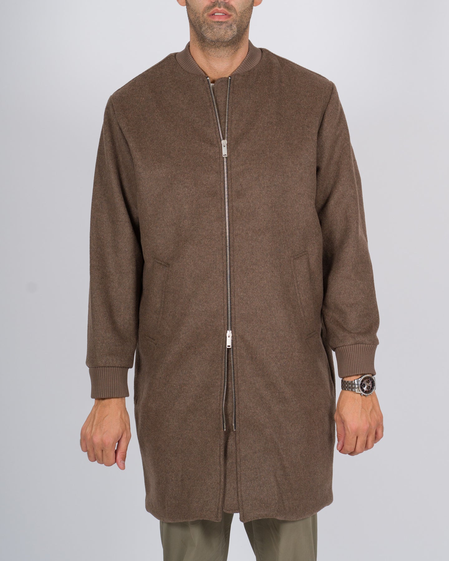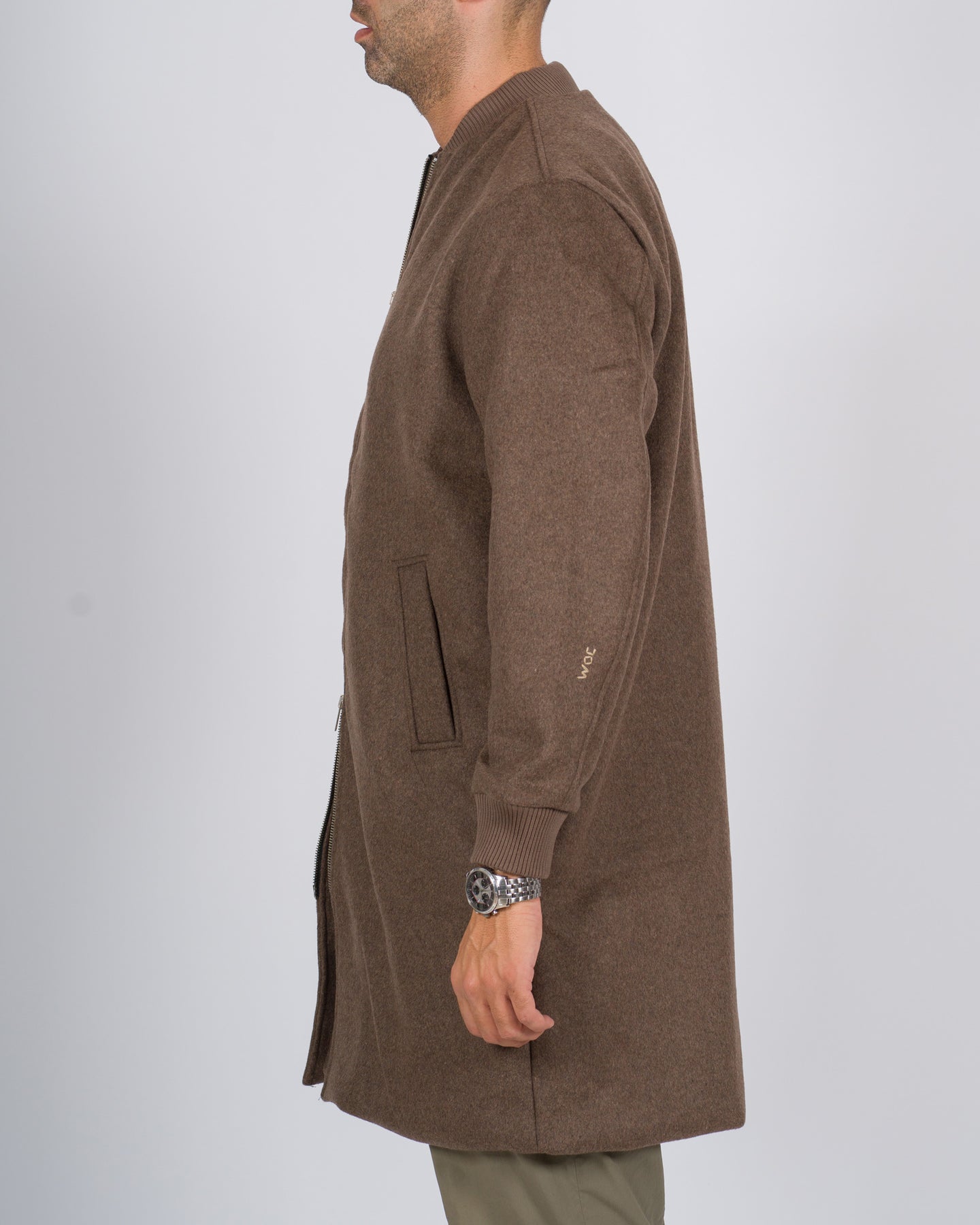 Un cappottino che unisce stile contemporaneo e funzionalità sartoriale, perfetto per i look urbani e casual-chic. Realizzato in panno di alta qualità, garantisce calore e struttura, mantenendo morbidezza al tatto.Il collo bomber rialzato protegge dal vento e conferisce un tocco moderno, mentre la chiusura frontale full zip consente praticità e versatilità. Tasche a filo sui lati sono integrate nel design per un effetto pulito e lineare, ideali per riporre piccoli oggetti o tenere le mani al caldo.La vestibilità leggermente over permette layering su maglie e felpe senza comprimere, mentre i polsini e il fondo morbidi garantiscono comfort e libertà di movimento. Il colore marrone intenso aggiunge calore alla palette invernale, rendendo il capo facilmente abbinabile a capi basici o a outfit più ricercati.